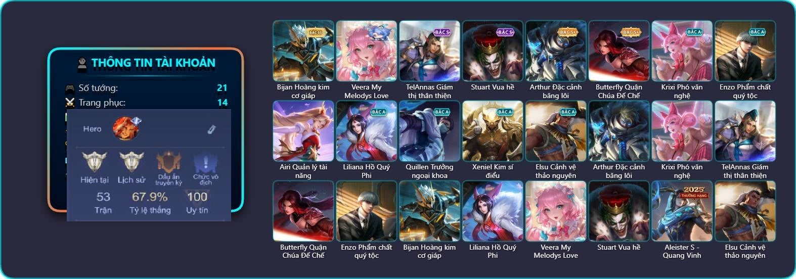 Arthur Si Tình Kiếm, Arthur Đặc cảnh băng lôi, Krixi Phó văn nghệ, Krixi Thuỷ Thủ, TelAnnas Chung Tình Tiễn, Telannas Dạ hội, Butterfly Teen Nữ Công Nghệ, Triệu Vân Quý Công Tử, Điêu Thuyền Mèo công nghệ, Violet Huy Chương Vàng, Quillen Nghịch thiên long đế, Gildur Đại gia học viện, Azzenka Quang Vinh 2.0, Celica S-Quang Vinh, Keera Nghệ sĩ Graffiti, Richter Cứu hộ, Teeri Tiểu kì lân, Raz Siêu việt, Xeniel Tay trống ngang tàng, Iggy Tiếng thét Hỗn mang, Dirak Đường chủ yêu giới, Fennik Đội đặc nhiệm, Fennik Shipper Siêu thanh, Slimz Sứ giả Thiên giới, Slimz Siêu Cấp Tối Thượng, Arum Quản lý tài năng, Toro Ngưu hải vương, Annette Xứ sở thần tiên, Tachi Đao khách vô tình, Omen Thuyền trưởng hải tặc, Liliana Thuỷ thủ hồ ly, Bijan Đập vỡ Cây đàn, Nakroth Producer Tia chớp, Zill Thần mộng mị, Roxie Cháy Phố, Max Chuyên gia đập hộp, Sinestrea S-Quang vinh