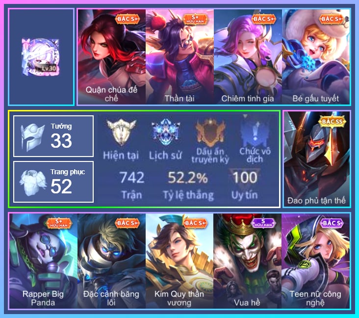 Arthur Đặc cảnh băng lôi, Krixi Phó văn nghệ, Krixi Thuỷ Thủ, TelAnnas Giám thị thân thiện, Telannas Dạ hội, Butterfly Quận Chúa Đế Chế, Violet Nữ đặc cảnh, Violet Huy Chương Vàng, Alice Dạ hội, Zephys Tư lệnh viễn chinh, Laville Kim quy thần vương, Yorn Đặc Nhiệm Swat, Yorn Soái ca bãi biển, Natalya Quý Cô Thủy Tề, Triệu Vân Dũng Sĩ Đồ Long, Maloch Ác Ma Địa Ngục, Maloch Tiệc hóa trang, Maloch Ác nhân vô tuyến, Maloch Đại ca Mukbang, Veera Cô giáo hắc ám, Kahlii Tử điệp, Ngộ Không Đạo tặc, Grakk Mèo thần tài, Stuart Vua hề, Mganga Pháp sư mèo, Murad S-Quang Vinh, Aleister Quỷ soái nguyệt tộc, Ata Mèo đi mưa, Sephera Phi vụ thế kỷ, Tachi Lãng khách, Zuka Đầu bếp hoàng cung, Zuka Rapper Big Panda, Keera Nghệ sĩ Graffiti, Enzo Phẩm chất quý tộc, Enzo Thần thoại Hy Lạp, Paine khúc nhạc tử vong, Elandorr Học viện Carano, Richter Quang vinh 2.0, Bright Kỳ Lân Soái, Celica S-Quang Vinh, Celica Tâm hồn trà sữa, Hayate Bạch lang, Lữ Bố Vũ điệu Samba, Yena Nữ hoàng thể thao, Ilumia Diva nổi loạn, Annette Xứ sở thần tiên, Arum Vũ khúc long hổ