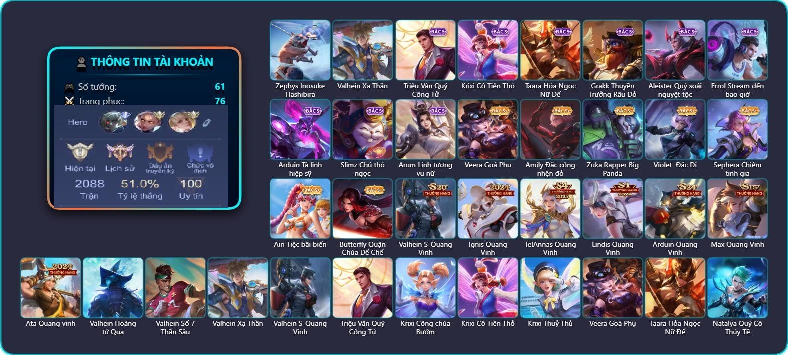 Valhein Hoàng tử Quạ, Valhein S-Quang Vinh, Taara Hỏa Ngọc Nữ Đế, Mina Chị đại lắm chiêu, Mina Tiệc Bánh Kẹo, Yorn Soái ca bãi biển, Mganga Pháp sư mèo, Gildur phượt thủ, Gildur Đại gia học viện, Gildur Đại võ sư, Azzenka Quang Vinh 2.0, Alice Xứ sở thần tiên, Alice Dạ hội, Skud Mafia, Lữ Bố Tư lệnh Robot, Krixi Cô Tiên Thỏ, Krixi Phó văn nghệ, Krixi Thuỷ Thủ, Natalya Quý Cô Thủy Tề, Natalya Phó nháy nhí nhảnh, Zephys Oán linh, Zephys Đầu bếp Sashimi, Kriknak Bọ Cánh Bạc, Stuart Gã hề, Kahlii Kim cô giáo chủ, Toro Bạch mao Ngưu, Grakk Thuyền Trưởng Râu Đỏ, Grakk Màu cờ sắc áo, Aleister Quỷ soái nguyệt tộc, Aleister Xứ sở thần tiên, Arthur Hoàng kim cốt, Arthur Si Tình Kiếm, Slimz Lẩu chua cay, TelAnnas Cảnh Vệ Rừng, TelAnnas Giám thị thân thiện, TelAnnas Chung Tình Tiễn, Telannas Dạ hội, TelAnnas Quang Vinh, Zuka Gấu Nhồi Bông, Zuka Rapper Big Panda, Murad S-Quang Vinh, Điêu Thuyền Nữ Vương Anh Đào, Điêu Thuyền Mèo công nghệ, Raz Đại tù trưởng, Ilumia Nữ Chúa Tuyết, Ilumia Ngược dòng thời gian, Airi Lễ hội mùa xuân, Ignis Bắc băng vương, Preyta Không Tặc, Darcy Pháp sư hỏa long, Sinestrea Đại tiểu thư 2, Tulen Phó kỷ luật, Qi Thiếu nữ mùa xuân, Qi Blogger Ẩm thực, Dirak Quý tộc, Dirak Ông bầu Showbiz, Paine khúc nhạc tử vong, Violet Nữ đặc cảnh, Violet Huy Chương Vàng, Amily Hội ám hoàng, Lauriel Đọa Lạc Thiên Sứ, Arum Thú Vệ Cổ Mộ, Ata Quang vinh, Zip Cá siêu quậy, Lumburr, Roxie Hầu gái, Roxie Lễ hội hoa, Roxie Hỏa thuật sư, Zill Diệt nguyệt tử sĩ, Omen Thuyền trưởng hải tặc, Richter Dạ hội, Hayate Bạch lang, Veres Chị đại học đường, Fennik Nhà thám hiểm, Fennik Tiệc Bánh Kẹo, Annette Xứ sở thần tiên, Rouie Quang Vinh, Aya Điệp viên ký ức, Bright Soái ca thánh điện