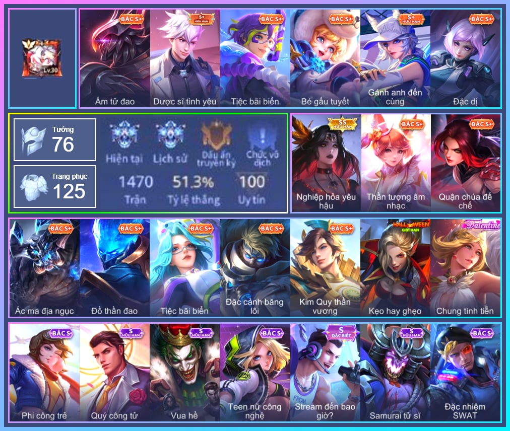 Valhein Hoàng tử Quạ, Valhein S-Quang Vinh, Krixi Cô Tiên Thỏ, Yorn Thế Tử Nguyệt Tộc, Yorn Soái ca bãi biển, Maloch Ác Ma Địa Ngục, Annette Xứ sở thần tiên, Preyta Không Tặc, Mina Đào tạo siêu sao, Arduin, Dirak Quý tộc, Dirak Ông bầu Showbiz, Amily Hội ám hoàng, Kaine Người dơi, Omega Hộ vệ ba bích, Violet Nữ đặc cảnh, Violet Đặc Dị, Violet Huy Chương Vàng, Hayate Bạch lang, TelAnnas Cảnh Vệ Rừng, Telannas Dạ hội, Natalya Quý Cô Thủy Tề, Ata Quang vinh, Điêu Thuyền Mèo công nghệ, Ryoma Đại Tướng Nguyệt Tộc, Ngộ Không Đạo tặc, Ngộ Không Cổ thần Ai Cập, Kahlii Siêu đầu bếp, Kahlii Tử điệp, Volkath Tư lệnh viễn chinh, Zuka Đầu bếp hoàng cung, Zuka Rapper Big Panda, Yena Nữ hoàng thể thao, Raz Saitama Cosplay, Errol Stream đến bao giờ, Kriknak Yêu trùng cổ mộ, Sinestrea Đại tiểu thư 2, Richter Dạ hội, Richter Quang vinh 2.0, Murad Thợ Săn Tiền Thưởng, Murad Đồ thần đao, Murad S-Quang Vinh, Sephera Chiêm tinh gia, Sephera Thủy Liên Hoa, Arthur Siêu sao Cricket, Rouie Quang Vinh, Tulen Nhà Thám Hiểm, Elandorr Soái tặc, Alice The Butterfly Mansion Girl, Bright Soái ca thánh điện, Liliana thần tượng âm nhạc, Fennik Nhà thám hiểm, Lauriel Nữ vương học đường 2, Xeniel Thiên Sứ Hủy Diệt, Ignis Bắc băng vương