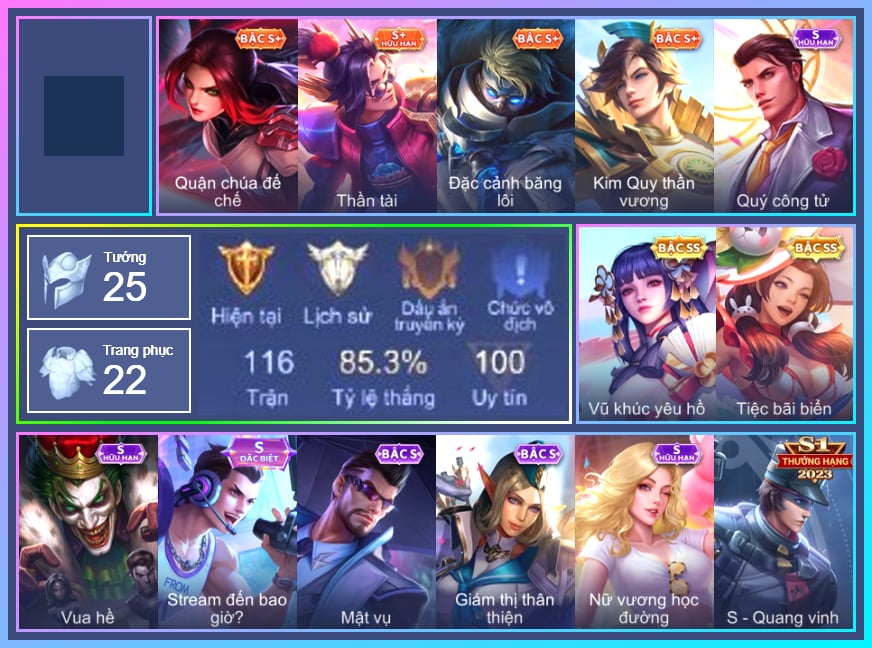 Valhein Hoàng tử Quạ, Valhein Quang Vinh, Valhein Số 7 Thần Sầu, Valhein S-Quang Vinh, Veera Goá Phụ, Mina Đào tạo siêu sao, Tulen Nhà Thám Hiểm, Tulen Phù Thủy Kiến Tạo, Tulen Dạ hội, Taara Đại tù trưởng, Taara Hỏa Ngọc Nữ Đế, Mganga Hề cung đình, Arthur Hoàng kim cốt, Arthur Siêu sao Cricket, Kriknak Bọ Cánh Bạc, Zill Dung nham, Gildur phượt thủ, Điêu Thuyền Nữ Vương Anh Đào, Điêu Thuyền Nữ y tá, Điêu Thuyền Hoa Hậu, Natalya Quý Cô Thủy Tề, Chaugnar Quang Vinh, Slimz Chú thỏ ngọc, Violet Nữ đặc cảnh, Violet Phi Công Trẻ, Violet Tay Súng Siêu Phẩm, Raz Đại tù trưởng, Nakroth Quân đoàn địa ngục, Jinna Đại Tư Tế, TelAnnas Cảnh Vệ Rừng, Telannas Dạ hội, TelAnnas Quang Vinh, Preyta Phi cơ F1, Aleister Quỷ soái nguyệt tộc, Zuka Đại Phú Ông, Zuka Rapper Big Panda, Ignis Quang Vinh, Moren Anh thợ điện, Teemee Tay đua siêu tốc, Lindis Quang Vinh, Arduin Quang Vinh 1, Arduin Tà linh hiệp sỹ, Alice Xứ sở thần tiên, Omen Sĩ Quan Viễn Chinh, Veres Đạo tặc, -Zip Gà siêu quậy2, Keera Thuỷ thủ, Capheny Hầu gái, Max Quang Vinh, Ryoma Đại Tướng Nguyệt Tộc, Ryoma Dạ hội, Elandorr Học viện Carano, Fennik Tay đua F1, Maloch Ác Ma Địa Ngục, Volkath Tư lệnh viễn chinh, Enzo Phẩm chất quý tộc, Laville Tay súng vô địch, Krixi Thuỷ Thủ, Murad Thiên Tài Sân Cỏ, Murad S-Quang Vinh, Airi Lễ hội mùa xuân, Dirak Quý tộc, Dirak Ông bầu Showbiz, Amily Thư ký, Amily Hội ám hoàng, Baldum, Roxie Lễ hội hoa, Ata Quang vinh, Sephera Chiêm tinh gia, Liliana Thuỷ thủ hồ ly, Annette Xứ sở thần tiên