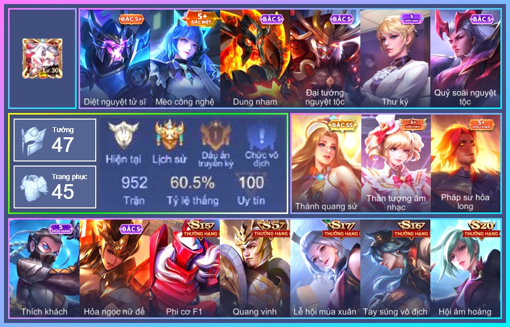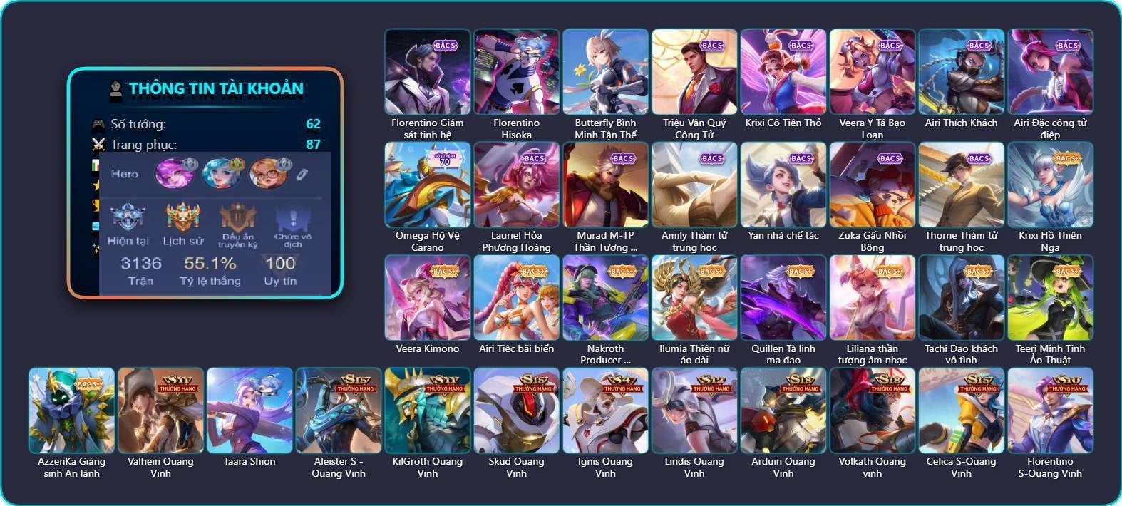 Valhein Hoàng tử Quạ, Valhein Quang Vinh, Valhein Số 7 Thần Sầu, Valhein S-Quang Vinh, Triệu Vân Quý Công Tử, Taara Hỏa Ngọc Nữ Đế, Gildur phượt thủ, Gildur Đại gia học viện, Gildur Đại võ sư, Yorn Soái ca bãi biển, Chaugnar Quang Vinh, Mganga Doombot Hủy Diệt, Kahlii Siêu đầu bếp, Kahlii Tử điệp, TelAnnas Cảnh Vệ Rừng, TelAnnas Chung Tình Tiễn, Telannas Dạ hội, Lindis Quang Vinh, Slimz Sứ giả Thiên giới, Ignis Quang Vinh, KilGroth Cảnh Vệ Biển, KilGroth Quang Vinh, Airi Ninja Xanh Lá, Airi Cấm Vệ Nguyệt Tộc, Airi Lễ hội mùa xuân, Zephys Phi thương, Zephys Tư lệnh viễn chinh, Zephys Đầu bếp Sashimi, Natalya Quý Cô Thủy Tề, Zuka Gấu Nhồi Bông, Violet Nữ đặc cảnh, Violet Đặc Dị, Violet Tay Súng Siêu Phẩm, Violet Huy Chương Vàng, Nakroth Chiến Binh Hỏa Ngục, Zill Lốc Địa Ngục, Zill Dung nham, Zill Thần mộng mị, Kriknak Bọ Cánh Bạc, Teemee Tay đua siêu tốc, Tulen Dạ hội, Ilumia Nữ Chúa Tuyết, Stuart Trò đùa tử vong, Stuart Gã hề, Krixi Thuỷ Thủ, Arduin Quang Vinh 1, Veres Đạo tặc, Aleister Quỷ soái nguyệt tộc, Preyta Phi cơ F1, Maloch Ác Ma Địa Ngục, Maloch Ác nhân vô tuyến, Max Hiệp Sĩ Nhí, Max Quang Vinh, Raz Đại tù trưởng, Raz Saitama Cosplay, Volkath Quang vinh, Azzenka Quang Vinh 2.0, Richter Quang vinh 2.0, Darcy Pháp sư hỏa long, Ishar Giấc Mơ Ngọt Ngào, Fennik Nhà thám hiểm, Fennik Đội đặc nhiệm, Fennik Tay đua F1, Hayate Bạch ảnh, Hayate Bạch lang, Capheny Hầu gái, Capheny S-Quang Vinh, Ngộ Không Đạo tặc, Dirak Quý tộc, Dirak Ông bầu Showbiz, Florentino Vũ kiếm sư, Florentino S-Quang Vinh, Errol Vượt ngục, Qi Thiếu nữ mùa xuân, Ryoma Thợ Săn Tiền Thưởng, Ryoma Đại Tướng Nguyệt Tộc, Ryoma Dạ hội, Amily Đặc cảnh NYPD, Amily Hội ám hoàng, Enzo Phẩm chất quý tộc, Enzo Leo núi, Laville Tay đua đường phố, Laville Tay súng vô địch, Arthur Si Tình Kiếm, Arthur Siêu sao Cricket, Murad S-Quang Vinh, Celica S-Quang Vinh, Sinestrea S-Quang vinh, Ata Quang vinh, Lữ Bố Nam Vương, Điêu Thuyền Nữ Vương Anh Đào, Điêu Thuyền Mèo công nghệ, Baldum Đồ chơi, Liliana Hồ Quý Phi, Liliana thần tượng âm nhạc, Liliana Thuỷ thủ hồ ly, Roxie Lễ hội hoa, Roxie Hỏa thuật sư, Bright Soái ca thánh điện, Elsu Tuyết ưng, Aya Điệp viên ký ức, Omen Thuyền trưởng hải tặc, Annette Xứ sở thần tiên, Quillen Trưởng ngoại khoa, Xeniel Thiên Sứ Hủy Diệt, Xeniel Shipper bánh mỳ, Tachi Đao khách vô tình|CÁC SKIN SS: |CÁC SKIN SSS: |CÁC SKIN ANIME: