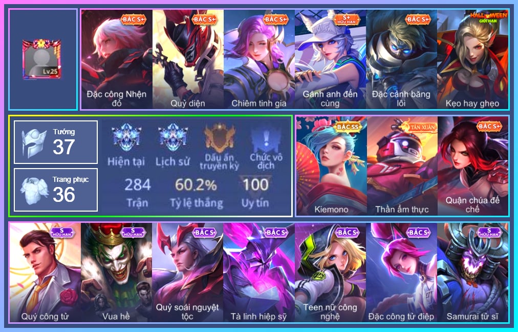 Valhein Hoàng tử Quạ, Valhein Số 7 Thần Sầu, Valhein Khiêu chiến, Krixi Công chúa Bướm, Krixi Xứ Sở Thần Tiên, Mganga Pháp sư mèo, Mganga Doombot Hủy Diệt, Butterfly Bình Minh Tận Thế, TelAnnas Cảnh Vệ Rừng, Telannas Dạ hội, Tel Annas Jujutsu Sorcerer, Mina Chị đại lắm chiêu, Yorn Vệ Binh ngân hà, Annette Xứ sở thần tiên, Toro Bạch mao Ngưu, Dirak Quý tộc, KilGroth Cảnh Vệ Biển, Amily Thám tử trung học, Airi Kiemono, Airi Lễ hội mùa xuân, Kaine Thợ Săn Chính Nghĩa, Lindis Đồng phục Shihakusho, Alice Xứ sở thần tiên, Zephys Tư lệnh viễn chinh, Veera Phù thủy Hội họa, Florentino Kiếm sĩ Olympic, Florentino S-Quang Vinh, Sinestrea S-Quang vinh, Kahlii Kim cô giáo chủ, Kahlii Rối Nước Thuỷ Đình, Ngộ Không Nhóc tỳ bá đạo, Kriknak Yêu trùng cổ mộ, Liliana Thuỷ thủ hồ ly, Zuka Gấu Nhồi Bông, Zuka Rapper Big Panda, Raz Đại tù trưởng, Điêu Thuyền Mèo công nghệ, Omen Sĩ Quan Viễn Chinh, Omen Thuyền trưởng hải tặc, Arthur Siêu sao Cricket, Laville Tay đua đường phố, Omega Hộ Vệ Carano, Paine khúc nhạc tử vong, Ata Quang vinh, Nakroth BBoy công nghệ, Nakroth Quán quân, Marja Linh Xà Tư Tế, Lữ Bố Hoả Long Chiến Thần, Lữ Bố Vũ điệu Samba, Hayate Bạch ảnh, Tulen Dạ hội, Xeniel Kim sí điểu, Murad M-TP Thần Tượng Học Đường, Astrid Hoa anh đào, Enzo Phẩm chất quý tộc, Ming, Volkath Quang vinh, Elsu Cảnh vệ thảo nguyên, Krizzix Crursed Corpse, Caesar Bão tố, Roxie Tiệc bánh kẹo, Bonnie S Quang Vinh