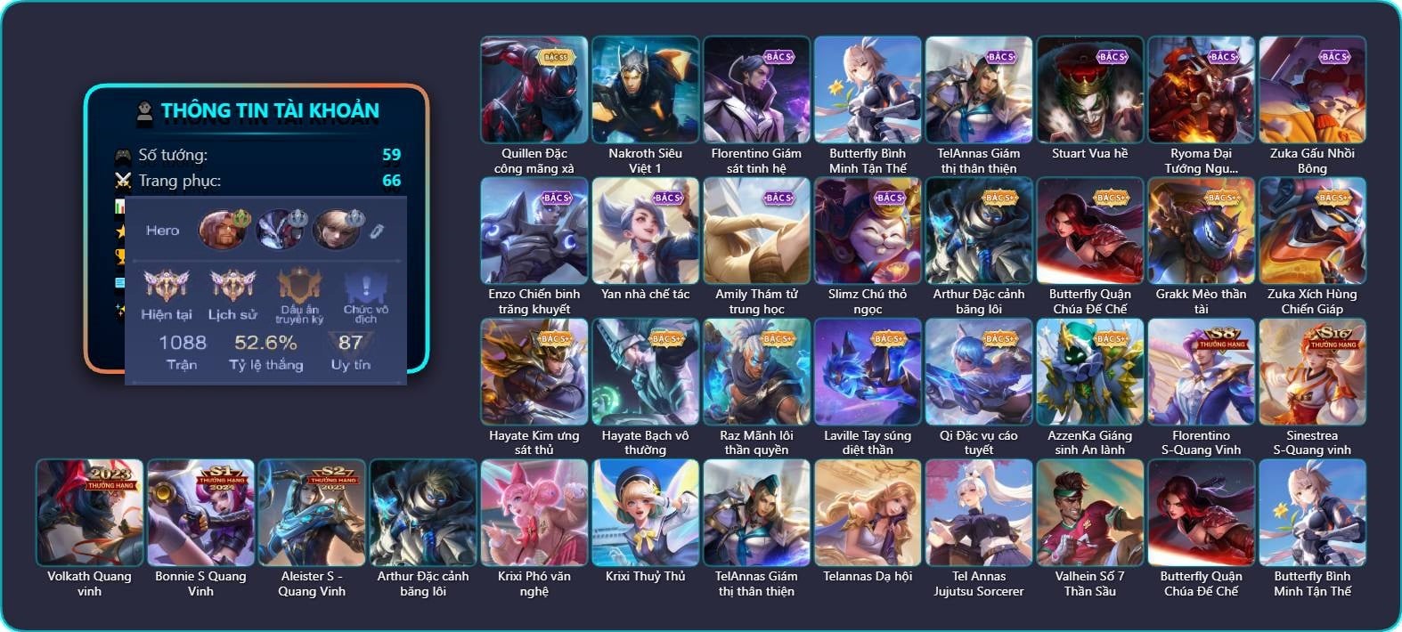 Arthur Đặc cảnh băng lôi, Krixi Phó văn nghệ, TelAnnas Giám thị thân thiện, Tel Annas Jujutsu Sorcerer, Butterfly Quận Chúa Đế Chế, Butterfly Bình Minh Tận Thế, Violet Huy Chương Vàng, Triệu Vân Quý Công Tử, Stuart Vua hề, Kaine Thợ Săn Chính Nghĩa, Sinestrea Đại tiểu thư 1, Ybneth Candy Bear, Omega Hộ Vệ Carano, Florentino Giám sát tinh hệ, Florentino S-Quang Vinh, Enzo Phẩm chất quý tộc, Enzo Hồng hạc thị vệ, KilGroth Cảnh Vệ Biển, Xeniel Kim sí điểu, Liliana Thuỷ thủ hồ ly, Capheny Hầu gái, Errol Vượt ngục, Thorne Giả kim thuật sư, Thorne Thám tử trung học, Kahlii Rối Nước Thuỷ Đình, Mganga Doombot Hủy Diệt, Yorn Soái ca bãi biển, Quillen Trưởng ngoại khoa, Yan nhà chế tác, Zuka Gấu Nhồi Bông, Raz Đại tù trưởng, Nakroth Tiệc Bãi Biển, Bonnie S Quang Vinh, Thane Khoảnh khắc vinh quang, Qi Đặc vụ cáo tuyết, Fennik Phi hành gia, Điêu thuyền Vũ điệu nghê thường, Zephys Đầu bếp Sashimi