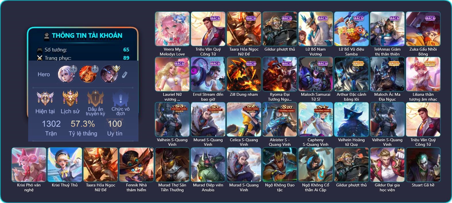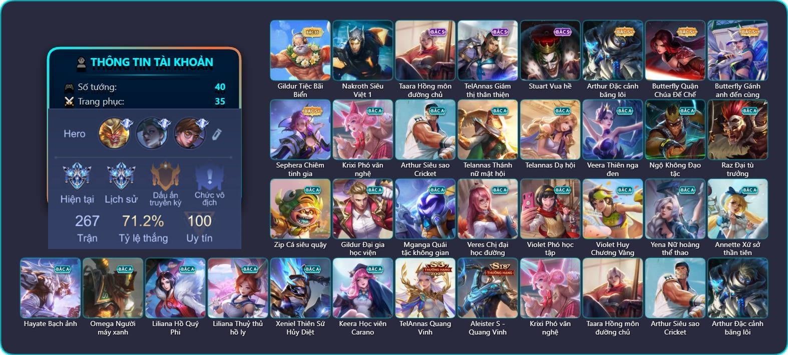 Valhein Hoàng tử Quạ, Triệu Vân Chiến tướng mùa đông, Krixi Xứ Sở Thần Tiên, Krixi Cô Tiên Thỏ, Krixi Phó văn nghệ, Krixi Thần Thoại Hy Lạp, Krixi Thuỷ Thủ, Gildur Tiệc Bãi Biển, Gildur phượt thủ, Gildur Đại gia học viện, TelAnnas Cảnh Vệ Rừng, Telannas Thánh nữ mật hội, Telannas Dạ hội, TelAnnas Quang Vinh, Yorn Cung thủ bóng đêm, Yorn Soái ca bãi biển, Kahlii Rối Nước Thuỷ Đình, Veera Goá Phụ, Taara Hỏa Ngọc Nữ Đế, Taara Tư lệnh hải âu, Mganga Pháp sư mèo, Mganga Doombot Hủy Diệt, Alice Bé Gấu Tuyết, Zephys Đầu bếp Sashimi, Florentino Thần thoại Hy Lạp, Florentino SEVEN, Florentino S-Quang Vinh, Ata Mèo đi mưa, Laville Tay súng vô địch, Laville Tiệc bãi biển, Quillen Trưởng ngoại khoa, Natalya Quý Cô Thủy Tề, Amily Đặc công nhện đỏ, Amily Thư ký, Amily Hội ám hoàng, Amily Thám tử trung học, KilGroth Cảnh Vệ Biển, Butterfly Thủy thủ, Butterfly Quận Chúa Đế Chế, Murad Thợ Săn Tiền Thưởng, Murad Đồ thần đao, Violet Nữ đặc cảnh, Violet Phi Công Trẻ, Violet Phó học tập, Violet Huy Chương Vàng, Errol Quái vật cương thi, Errol Stream đến bao giờ, Ryoma Đại Tướng Nguyệt Tộc, Thane Kẻ Hủy Diệt, Yena Nữ hoàng thể thao, Aoi Tiệc bãi biển, Grakk Thuyền Trưởng Râu Đỏ, Grakk Khô Lâu Đại Tướng, Grakk Thần ẩm thực, Dirak Quý tộc, Maloch Đại ca Mukbang, Airi Quái xế công nghệ, Airi Phó kiếm đạo, Điêu Thuyền Mèo công nghệ, Astrid Hoa anh đào, Max Tiểu King Kong, Max Trà Chanh, Slimz Thỏ nhồi bông, Slimz Siêu Cấp Tối Thượng, Arduin Tà linh hiệp sỹ, Omega Hộ Vệ Carano, Liliana Thuỷ thủ hồ ly, Lauriel Đọa Lạc Thiên Sứ, Lauriel Hỏa Phượng Hoàng, Lauriel Nữ vương học đường 2, Krizzix Crursed Corpse, Dextra Chiến binh quyến rũ, Dextra Quý cô Tuổi Dần, Aleister Quỷ soái nguyệt tộc, Sephera Chiêm tinh gia, Raz Đại tù trưởng, Roxie Lễ hội hoa, Roxie Hỏa thuật sư, Rouie Quang Vinh, Qi Blogger Ẩm thực, Arthur Siêu sao Cricket, Richter Dạ hội, Richter Quang vinh 2.0, Capheny Hầu gái, Capheny Siêu cấp tin tặc, Capheny S-Quang Vinh, Zuka Xích Hùng Chiến Giáp, Fennik Nhà thám hiểm, Fennik Đội đặc nhiệm, Fennik Tay đua F1, Volkath Quang vinh, Azzenka Quang Vinh 2.0, Aya Điệp viên ký ức, Aya Thủy thủ, Veres Đạo tặc, Annette Xứ sở thần tiên, Tachi Đao khách vô tình, Arum Linh tượng vu nữ, Arum Thần tượng nhạc Rock, Ishar Giấc Mơ Ngọt Ngào, Ishar Tiểu thư gấu trúc, Ishar Capoo Boom, Xeniel Thiên Sứ Hủy Diệt, Thorne Thám tử trung học, Bright Soái ca thánh điện, Bright Kỳ Lân Soái, Bonnie S Quang Vinh, Elandorr Soái tặc, DArcy Bác sĩ thú y, Kaine Thợ Săn Chính Nghĩa, Ignis Vì sao con khóc, Ybneth Candy Bear, Ormarr Quỷ Vệ