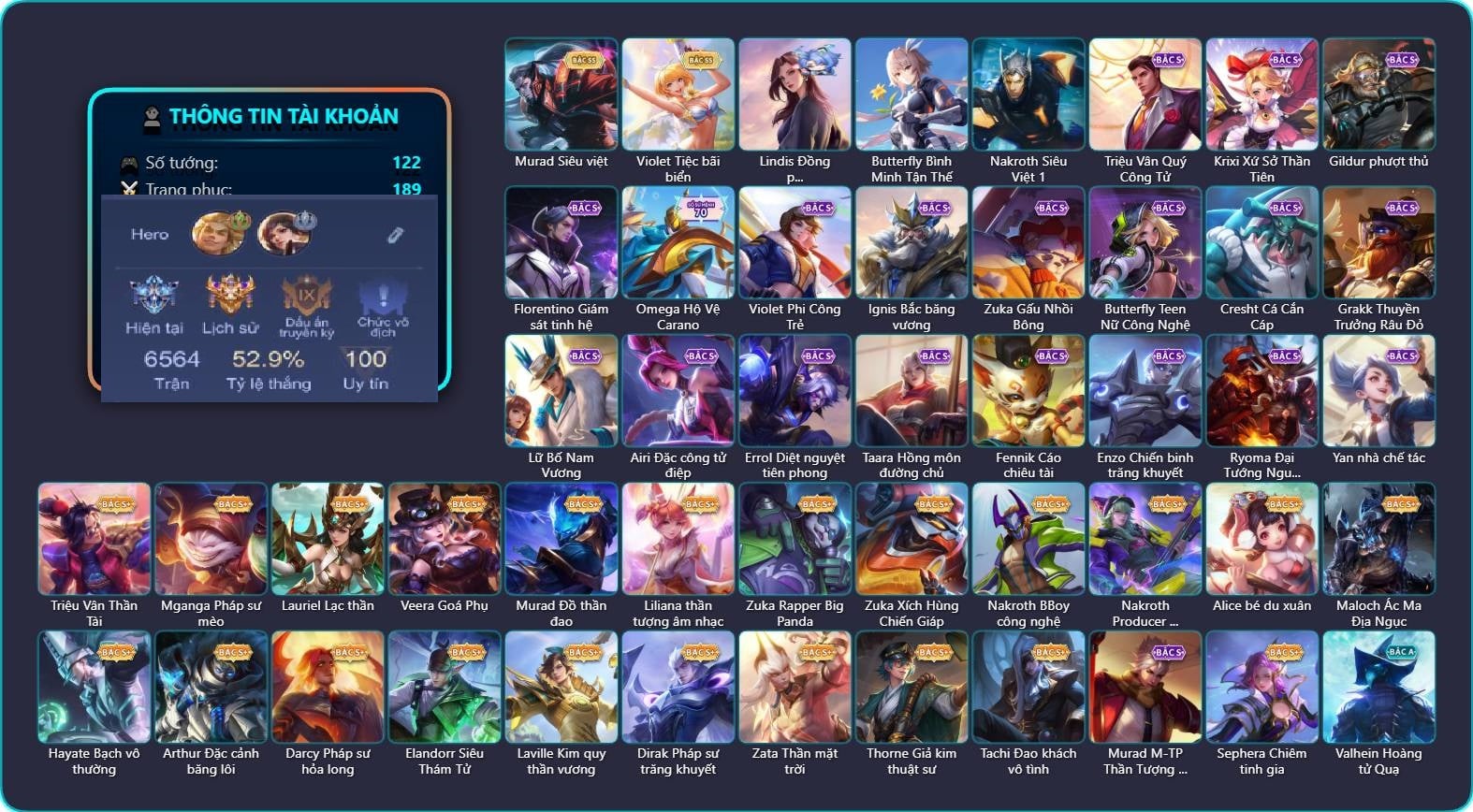 Valhein Vũ khí tối thượng, Valhein Số 7 Thần Sầu, Valhein S-Quang Vinh, TelAnnas Giám thị thân thiện, TelAnnas Quang Vinh, Tel Annas Jujutsu Sorcerer, Arthur Hoàng kim cốt, Arthur Siêu sao Cricket, Arthur Đặc cảnh băng lôi, Krixi Cô Tiên Thỏ, Krixi Phó văn nghệ, Krixi Thuỷ Thủ, Lữ Bố Kỵ Sĩ Âm Phủ, Lữ Bố Vũ điệu Samba, Butterfly Teen Nữ Công Nghệ, Butterfly Nữ Quái Nổi Loạn, Butterfly Quận Chúa Đế Chế, Butterfly Gánh anh đến cùng, Violet Phi Công Trẻ, Violet Đặc Dị, Violet Huy Chương Vàng, Natalya Quý Cô Thủy Tề, Triệu Vân Quý Công Tử, Triệu Vân Thần Tài, Alice Xứ sở thần tiên, Alice The Butterfly Mansion Girl, Maloch Ác Ma Địa Ngục, Veera Goá Phụ, Omen Ám tử đao, Omen Thuyền trưởng hải tặc, Stuart Vua hề, Stuart Gã hề, Grakk Thuyền Trưởng Râu Đỏ, Grakk Khô Lâu Đại Tướng, Arum Nữ hoàng gấu xám, Mina Tiểu thư đoạt hồn, Zuka Gấu Nhồi Bông, Zuka Đầu bếp hoàng cung, Zuka Rapper Big Panda, Laville Tay đua đường phố, Gildur phượt thủ, Gildur Đại gia học viện, Yorn Đặc Nhiệm Swat, Arduin, Arduin Tà linh hiệp sỹ, Toro Đặc cảnh NYPD, Amily Đặc công nhện đỏ, Amily Hội ám hoàng, Amily Nữ đội trưởng, Ngộ Không Đạo tặc, Ngộ Không Ngộ Khá Trẩu, Ngộ Không Nhóc tỳ bá đạo, Airi Thích Khách, Airi Cấm Vệ Nguyệt Tộc, Airi Kiemono, Nakroth BBoy công nghệ, Nakroth Quán quân, Florentino Thần thoại Hy Lạp, Ata Mèo đi mưa, Lindis Đồng phục Shihakusho, Qi Thiếu nữ pháo hoa, Qi Blogger Ẩm thực, Bright Kỳ Lân Soái, Zip Cá siêu quậy, Ryoma Thợ Săn Tiền Thưởng, Mganga Doombot Hủy Diệt, Thane Kẻ Hủy Diệt, Thane Mật vụ, Enzo Phẩm chất quý tộc, Enzo Thần thoại Hy Lạp, Enzo Leo núi, Tulen Phù Thủy Kiến Tạo, Tulen Dạ hội, Taara Hỏa Ngọc Nữ Đế, Raz Đại tù trưởng, Raz Băng Quyền Quán Quân, Roxie Lễ hội hoa, Roxie Hỏa thuật sư, Hayate Quỷ diện, Hayate Bạch lang, Omega Hộ vệ ba bích, Omega Hộ Vệ Carano, Errol Stream đến bao giờ, Murad Thợ Săn Tiền Thưởng, Murad S-Quang Vinh, Richter Bá tước, Richter Quang vinh 2.0, Kahlii Siêu đầu bếp, Sephera Chiêm tinh gia, Sephera Thủy Liên Hoa, Ilumia Ngược dòng thời gian, Slimz Xứ sở thần tiên, Slimz Sứ giả Thiên giới, Fennik Nhà thám hiểm, Fennik Shipper Siêu thanh, Ignis Bắc băng vương, Celica S-Quang Vinh, Celica Tâm hồn trà sữa, KilGroth Cảnh Vệ Biển, Aya Điệp viên ký ức, Capheny S-Quang Vinh, Kaine Đôi Cánh Đại Dương, Kaine Người dơi, Zill Thần mộng mị, Azzenka Quang Vinh 2.0, Dirak Cảnh Vệ Bầu Trời, Dirak Đường chủ yêu giới, Keera Nghệ sĩ Graffiti, Kriknak ST.L-162, Max Hiệp Sĩ Nhí, Annette Xứ sở thần tiên, Sinestrea S-Quang vinh