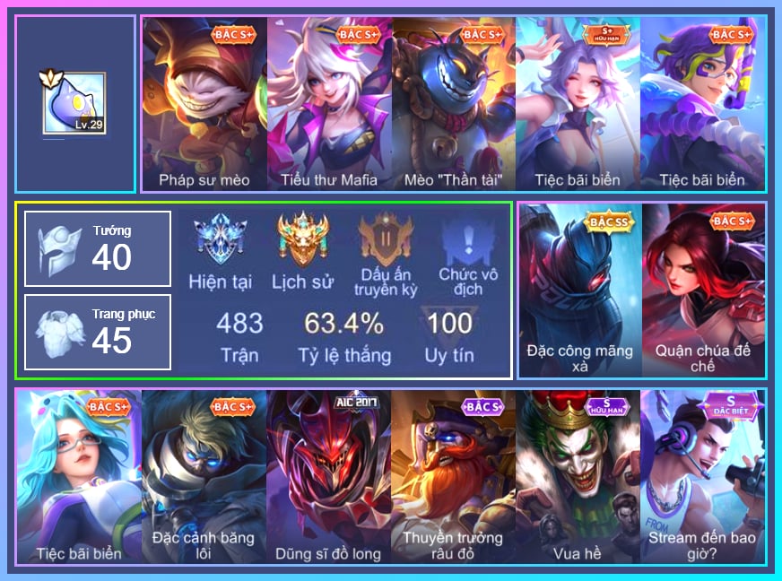 Valhein Hoàng tử Quạ, Valhein Quang Vinh, Valhein Số 7 Thần Sầu, Valhein Khiêu chiến, Valhein S-Quang Vinh, Triệu Vân Quang Vinh, Gildur phượt thủ, Kahlii Siêu đầu bếp, Arthur Hoàng kim cốt, Arthur Lãnh chúa xương, Arthur Siêu sao Cricket, Arthur Đặc cảnh băng lôi, Mganga Tiệc Bánh Kẹo, Mganga Pháp sư mèo, Mganga Doombot Hủy Diệt, Thane Quang vinh, Điêu Thuyền Nữ Vương Anh Đào, Điêu Thuyền Mèo công nghệ, Butterfly Teen Nữ Công Nghệ, Skud Quang Vinh, AzzenKa Linh Hồn Lữ Khách, Azzenka Quang Vinh 2.0, AzzenKa Giáng sinh An lành, Toro Đặc cảnh NYPD, Toro Bạch mao Ngưu, Yorn Cung thủ bóng đêm, Lauriel Đọa Lạc Thiên Sứ, Zuka Gấu Nhồi Bông, Zuka Đầu bếp hoàng cung, Zuka Rapper Big Panda, Kaine Người dơi, Raz Đại tù trưởng, Zephys Oán linh, Zephys Phi thương, Maloch Ác Ma Địa Ngục, Slimz Thỏ Thợ Mỏ, Slimz Chú thỏ ngọc, Slimz Sứ giả Thiên giới, Omega Hộ Vệ Carano, Ngộ Không Đạo tặc, Zill Dung nham, Zill Diệt nguyệt tử sĩ, Violet Nữ đặc cảnh, Violet Đặc Dị, Violet Tay Súng Siêu Phẩm, Moren Anh thợ điện, Moren Lính cứu hỏa, Aleister Quang Vinh, Aleister Quỷ soái nguyệt tộc, Nakroth Quân đoàn địa ngục, Nakroth BBoy công nghệ, Nakroth Producer Tia chớp, Grakk Thuyền Trưởng Râu Đỏ, Grakk Khô Lâu Đại Tướng, Grakk Thần ẩm thực, Chaugnar Quang Vinh, Murad Thợ Săn Tiền Thưởng, Murad S-Quang Vinh, Preyta Không Tặc, Preyta Phi cơ F1, Telannas Thánh nữ mật hội, Telannas Dạ hội, TelAnnas Quang Vinh, KilGroth Cảnh Vệ Biển, KilGroth Quang Vinh, Alice Xứ sở thần tiên, Alice Dạ hội, Lữ Bố Nam Vương, Lữ Bố Hoả Long Chiến Thần, Airi Thích Khách, Airi Lễ hội mùa xuân, Lindis Quang Vinh, Arduin, Arduin Quang Vinh, Arduin Tà linh hiệp sỹ, Elsu Mafia, Lumburr, Ignis Quang Vinh, Ignis Bắc băng vương, Roxie Hầu gái, Roxie Lễ hội hoa, Roxie Hỏa thuật sư, Omen Thuyền trưởng hải tặc, Fennik Tay đua F1, Hayate Bạch ảnh, Hayate Bạch lang, Sephera Chiêm tinh gia, Sephera Phi vụ thế kỷ, Amily Đặc cảnh NYPD, Amily Đặc công nhện đỏ, Amily Hội ám hoàng, Kriknak Bọ Cánh Bạc, Kriknak Yêu trùng cổ mộ, Max Quang Vinh, Volkath Tư lệnh viễn chinh, Volkath Quang vinh, Keera Y tá lạ, Ryoma Thợ Săn Tiền Thưởng, Ryoma Đại Tướng Nguyệt Tộc, Florentino Vũ kiếm sư, Florentino Thần thoại Hy Lạp, Florentino S-Quang Vinh, Enzo Phẩm chất quý tộc, Enzo Thần thoại Hy Lạp, Capheny S-Quang Vinh, Teemee Tay đua siêu tốc, Richter Quang vinh 2.0, Celica S-Quang Vinh, Yena Hoạt náo viên, Rouie Quang Vinh, Wisp Hải Tặc Nhí, Wisp Ếch nhồi bông, Laville Tay đua đường phố, Laville Tay súng vô địch, Laville Kim quy thần vương, Annette Xứ sở thần tiên, Dirak Quý tộc, Dirak Đường chủ yêu giới, Thorne Giả kim thuật sư, Ata Quang vinh, Dextra Lữ khách cao nguyên, Allain Lân sư Vũ thần, Baldum, Baldum Đồ chơi, Zata Tư lệnh viễn chinh, Qi Thiếu nữ pháo hoa, Qi Blogger Ẩm thực, Tachi Đao khách vô tình, Bonnie S Quang Vinh, Xeniel Thiên Sứ Hủy Diệt, Sinestrea S-Quang vinh, Biron Võ sĩ Giác đấu, Marja Linh Xà Tư Tế, Dolia Môn đồ tập sự