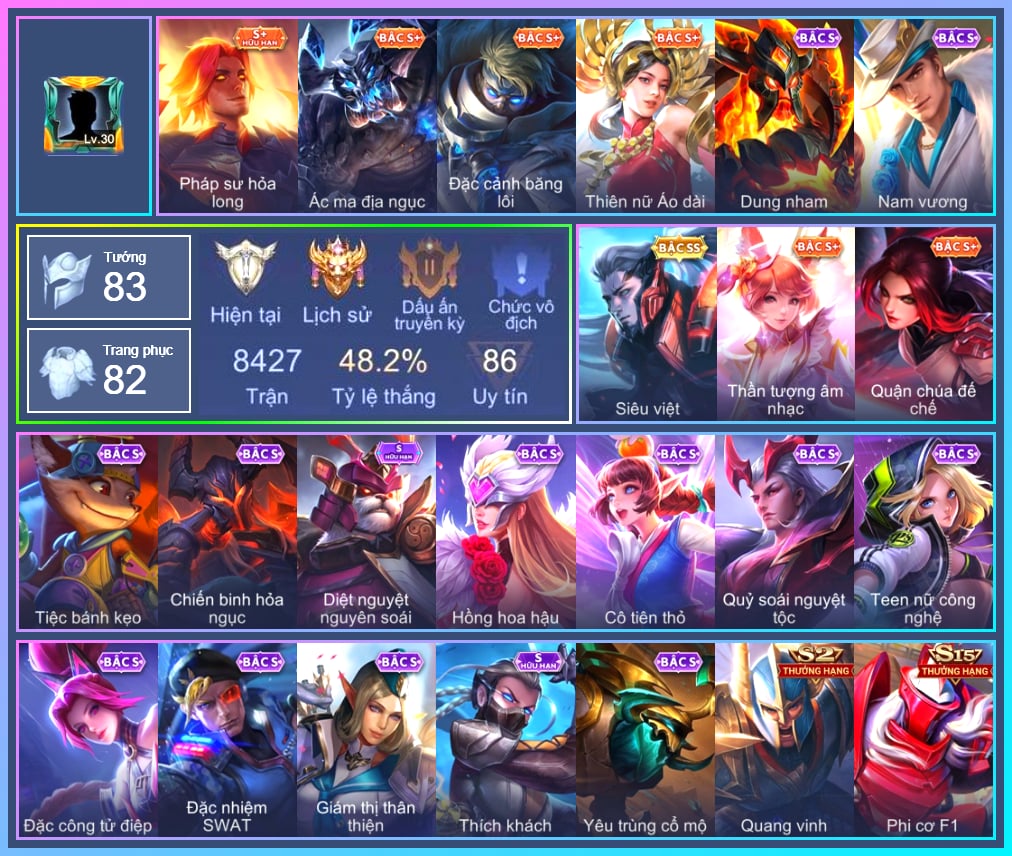 Arthur Siêu sao Cricket, Arthur Đặc cảnh băng lôi, Krixi Xứ Sở Thần Tiên, Krixi Phó văn nghệ, Krixi Thuỷ Thủ, TelAnnas Giám thị thân thiện, TelAnnas Chung Tình Tiễn, Telannas Thánh nữ mật hội, Telannas Dạ hội, Valhein Hoàng tử Quạ, Valhein Số 7 Thần Sầu, Valhein Khiêu chiến, Butterfly Quận Chúa Đế Chế, Butterfly Bình Minh Tận Thế, Violet Huy Chương Vàng, Omen Sĩ Quan Viễn Chinh, Omen Chiến binh trăng khuyết, Natalya Quý Cô Thủy Tề, Triệu Vân Quý Công Tử, Lauriel Nữ vương học đường 2, Allain Lân sư Vũ thần, Maloch Ác nhân vô tuyến, Veera Thiên nga đen, Veera Phù thủy Hội họa, Lữ Bố Hoả Long Chiến Thần, Lữ Bố Vũ điệu Samba, Stuart Vua hề, Grakk Thuyền Trưởng Râu Đỏ, Alice Dạ hội, Alice The Butterfly Mansion Girl, Capheny S-Quang Vinh, Raz Đại tù trưởng, Zuka Gấu Nhồi Bông, Zuka Đầu bếp hoàng cung, Zuka Rapper Big Panda, Aleister Thiếu Niên Hắc Ám, Ilumia Nữ Chúa Tuyết, Ilumia Ngược dòng thời gian, AzzenKa Giáng sinh An lành, Amily Khủng long xanh, Amily Thám tử trung học, Zephys Tư lệnh viễn chinh, Laville Kim quy thần vương, Nakroth BBoy công nghệ, Nakroth Siêu Việt 1, Yan nhà chế tác, Liliana thần tượng âm nhạc, Yorn Đặc Nhiệm Swat, Điêu thuyền Vũ điệu nghê thường, Ngộ Không Đặc vụ băng hầu, Ngộ Không Cổ thần Ai Cập, Murad Điệp viên Anubis, Murad S-Quang Vinh, Xeniel Thiên Sứ Hủy Diệt, Xeniel Shipper bánh mỳ, Kahlii Siêu đầu bếp, Errol Vượt ngục, Keera Nghệ sĩ Graffiti, Kaine Thợ Săn Chính Nghĩa, Richter Quang vinh 2.0, Roxie Hỏa thuật sư, Bright Soái ca thánh điện, Zill Thần mộng mị, Yena Nữ hoàng thể thao, Dextra Chiến binh quyến rũ, Dextra Lữ khách cao nguyên, Tulen Tân Thần Thiên Hà, Hayate Bạch ảnh, Hayate Bạch lang, Gildur Đại gia học viện, Ryoma Ailing Samurai, Taara Tư lệnh hải âu, Celica S-Quang Vinh, Qi Đặc vụ cáo tuyết, Florentino Thần thoại Hy Lạp, Florentino S-Quang Vinh, Tachi Đao khách vô tình, Dolia Môn đồ tập sự, Sinestrea S-Quang vinh, Omega Hộ Vệ Carano, Ybneth Candy Bear, Mganga Doombot Hủy Diệt, Max Hiệp Sĩ Nhí, Thorne Ước nguyện giáng sinh, Volkath Xung thiên thần tướng, Thane Khoảnh khắc vinh quang, Ming thầy tướng, KilGroth Cảnh Vệ Biển, Enzo Phẩm chất quý tộc, Bonnie S Quang Vinh, Paine khúc nhạc tử vong, Annette Xứ sở thần tiên, Mina Tiểu thư đoạt hồn, Slimz Sứ giả Thiên giới, Ignis Vì sao con khóc
