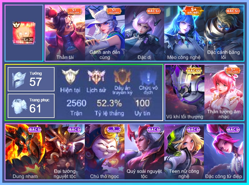 Valhein Hoàng tử Quạ, Valhein Số 7 Thần Sầu, Valhein Xạ Thần, Valhein S-Quang Vinh, Triệu Vân Quý Công Tử, Triệu Vân Thần Tài, Krixi Phó văn nghệ, Krixi Thuỷ Thủ, Taara Hỏa Ngọc Nữ Đế, Mganga Hề cung đình, Mganga Doombot Hủy Diệt, Grakk Thuyền Trưởng Râu Đỏ, Maloch Samurai Tử Sĩ, Maloch Ác nhân vô tuyến, Toro Ngưu hải vương, Annette Xứ sở thần tiên, Preyta Không Tặc, Nakroth BBoy công nghệ, Nakroth Producer Tia chớp, Zephys Siêu việt, Zephys Phi thương, Zephys Tư lệnh viễn chinh, Gildur Thuyền trưởng râu bạc, Dirak Quý tộc, Dirak Đường chủ yêu giới, Lauriel Đọa Lạc Thiên Sứ, Arduin, Arduin Tà linh hiệp sỹ, Amily Đặc công nhện đỏ, Amily Hội ám hoàng, Keera Thuỷ thủ, Paine khúc nhạc tử vong, Ata Quang vinh, Veera Goá Phụ, Veera Thiên nga đen, Mina Tiệc Bánh Kẹo, Mina Đào tạo siêu sao, Điêu Thuyền Mèo công nghệ, Murad Thợ Săn Tiền Thưởng, Murad Điệp viên Anubis, Murad S-Quang Vinh, Kahlii Kim cô giáo chủ, TelAnnas Cảnh Vệ Rừng, Telannas Thánh nữ mật hội, Telannas Dạ hội, TelAnnas Quang Vinh, Tel Annas Jujutsu Sorcerer, Errol Stream đến bao giờ, KilGroth Cảnh Vệ Biển, Hayate Bạch lang, Hayate Bạch vô thường, Florentino Vũ kiếm sư, Veres Chị đại học đường, Tachi Đao khách vô tình, Dextra Quý cô Tuổi Dần, Qi Thiếu nữ pháo hoa, Celica S-Quang Vinh, Yena Nữ hoàng thể thao, Yena Nữ cướp biển, Zuka Phát Tài, Zuka Gấu Nhồi Bông, Zuka Đầu bếp hoàng cung, Jinna Hỏa nhãn ma vương, Enzo Phẩm chất quý tộc, Enzo Thần thoại Hy Lạp, Enzo Leo núi, Tulen Phù Thủy Kiến Tạo, Kriknak Yêu trùng cổ mộ, Capheny S-Quang Vinh, Zata Tư lệnh viễn chinh, Fennik Nhà thám hiểm, Fennik Đội đặc nhiệm, Fennik Tiệc Bánh Kẹo, Max Chuyên gia đập hộp, Violet Nữ đặc cảnh, Violet Phó học tập, Violet Huy Chương Vàng, Slimz Thỏ nhồi bông, Slimz Lẩu chua cay, Slimz Sứ giả Thiên giới, Slimz Siêu Cấp Tối Thượng, Azzenka Quang Vinh 2.0, Ilumia Nữ Chúa Tuyết, Ngộ Không Cổ thần Ai Cập, Sephera Chiêm tinh gia, Bright Soái ca thánh điện, Bright Kỳ Lân Soái, Elandorr Soái tặc, Elandorr Phi vụ thế kỷ, Aleister Quỷ soái nguyệt tộc, Raz Đại tù trưởng, Roxie Hầu gái, Roxie Lễ hội hoa, Roxie Hỏa thuật sư, Ignis Bắc băng vương, Omega Cỗ Máy Siêu Tốc, Sinestrea Giấc mơ trưa, Sinestrea S-Quang vinh, Arthur Siêu sao Cricket, Rouie Quang Vinh, Bonnie S Quang Vinh, Laville Kim quy thần vương, Alice The Butterfly Mansion Girl, Baldum Đồ chơi, Ryoma Thợ Săn Tiền Thưởng, Marja Linh Xà Tư Tế, Ybneth Candy Bear