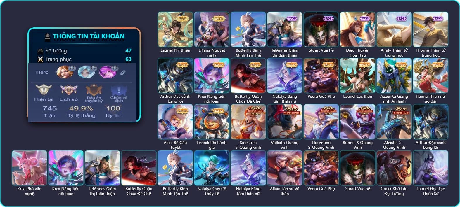 Valhein Hoàng tử Quạ, Valhein Xạ Thần, Triệu Vân Chiến tướng mùa đông, Krixi Phó văn nghệ, Mina Đào tạo siêu sao, Mina Cẩm y vệ Kim Ô, Toro Trung Phong Cắm, Mganga Hề cung đình, Mganga Pháp sư mèo, Kahlii Siêu đầu bếp, Alice Xứ sở thần tiên, TelAnnas Chung Tình Tiễn, Telannas Thánh nữ mật hội, Telannas Dạ hội, Tel Annas Jujutsu Sorcerer, Gildur Đại gia học viện, Veera Bách hoa tiên nữ, Tulen Nhà Thám Hiểm, Ignis Hỏa Thuật Sư, Ignis Quang Vinh, Ignis Bắc băng vương, Zephys Tư lệnh viễn chinh, Zephys Đầu bếp Sashimi, Butterfly Nữ Quái Nổi Loạn, Marja Linh Xà Tư Tế, Violet Phó học tập, Violet Đặc Dị, Violet Tay Súng Siêu Phẩm, Violet Huy Chương Vàng, Violet Thần long tỷ tỷ, Violet Nobara Kugisaki, Lauriel Đọa Lạc Thiên Sứ, Lauriel Hỏa Phượng Hoàng, Preyta Phi cơ F1, Arthur Siêu sao Cricket, Airi Quái xế công nghệ, Airi Cấm Vệ Nguyệt Tộc, Arduin Quang Vinh, Maloch Ác nhân vô tuyến, Maloch Đại ca Mukbang, Ngộ Không Cổ thần Ai Cập, Annette Nữ quản ga, Lindis Thám Tử Tư, Lindis Quang Vinh, Xeniel Thiên Sứ Hủy Diệt, Xeniel Cẩm vệ, Elsu Mafia, Hayate Bạch ảnh, Hayate Quỷ diện, Điêu Thuyền Nữ Vương Anh Đào, Fennik Nhà thám hiểm, Fennik Phi hành gia, Lữ Bố Kỵ Sĩ Âm Phủ, Lữ Bố Vũ điệu Samba, Quillen Trưởng ngoại khoa, Ryoma Đại Tướng Nguyệt Tộc, Ryoma Dạ hội, Max Quang Vinh, Teemee Tay đua siêu tốc, Wisp Rồng đi bộ, Slimz Lẩu chua cay, Slimz Sứ giả Thiên giới, Zill Dung nham, Richter Quang vinh 2.0, Azzenka Quang Vinh 2.0, Roxie Cháy Phố, Roxie Hỏa thuật sư, Aya Điệp viên ký ức, Baldum Đồ chơi, Bright Soái ca thánh điện, Sinestrea Lữ khách sa mạc, Liliana Hồ Quý Phi, Liliana thần tượng âm nhạc, Capheny Hầu gái, Capheny S-Quang Vinh, Raz Đại tù trưởng, Raz Saitama Cosplay, Raz MC Võ đài, KilGroth Cảnh Vệ Biển, Laville Tay đua đường phố, Murad Đồ thần đao, Ybneth Candy Bear, Bonnie S Quang Vinh, Arum Linh tượng vu nữ, Lorion Chiến giáp hắc ám, Nakroth BBoy công nghệ