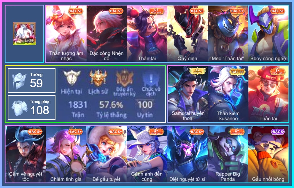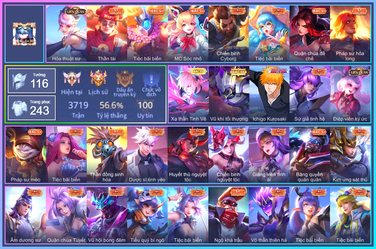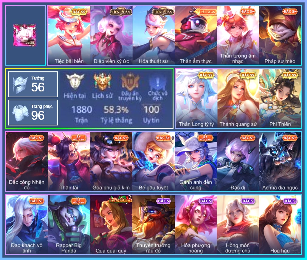 Valhein Hoàng tử Quạ, Valhein Đại Công Tước, Valhein Quang Vinh, Valhein S-Quang Vinh, Triệu Vân Thần Tài, Veera Cô giáo hắc ám, Veera Goá Phụ, Veera Thiên nga đen, Natalya Mị muốn đi chơi, Natalya Quý Cô Thủy Tề, Natalya nghiệp hỏa yêu hậu, Natalya Băng tâm thần nữ, Natalya Nghệ sĩ ma mị, Natalya Thần Phú Quý, Yorn Cung thủ bóng đêm, Yorn Đặc Nhiệm Swat, Yorn Long thần soái, Yorn Lục nguyệt cung, Yorn Soái ca bãi biển, Taara Đại tù trưởng, Taara Hỏa Ngọc Nữ Đế, Skud Quang Vinh, Toro Đặc cảnh NYPD, Toro Trung Phong Cắm, Gildur phượt thủ, Gildur Đại gia học viện, Gildur Thuyền trưởng râu bạc, Helen Cảnh Vệ Rừng, Helen Ngủ trong rừng, Nakroth Chiến Binh Hỏa Ngục, Nakroth Quân đoàn địa ngục, Ilumia Nữ Chúa Tuyết, Ilumia Thiên nữ áo dài, Ilumia Ngược dòng thời gian, Omega Người máy xanh, Chaugnar Ác Mộng Sinh Hóa, Chaugnar Quang Vinh, Mina Tiểu thư đoạt hồn, Mina Chị đại lắm chiêu, Azzenka Quang Vinh 2.0, Lauriel Đọa Lạc Thiên Sứ, Airi Thích Khách, Airi Ninja Xanh Lá, Airi Lễ hội mùa xuân, Jinna Đại Tư Tế, Jinna Dạ xoa vương, Tulen Nhà Thám Hiểm, Tulen Phù Thủy Kiến Tạo, Tulen Dạ hội, Aleister Thiếu Niên Hắc Ám, Aleister Quỷ soái nguyệt tộc, Violet Nữ đặc cảnh, Violet Phó học tập, Violet Đặc Dị, Violet Tay Súng Siêu Phẩm, Điêu Thuyền Nữ Vương Anh Đào, Điêu Thuyền Nữ y tá, Điêu Thuyền Hoa Hậu, Điêu thuyền Vũ điệu nghê thường, Điêu Thuyền Tà linh pháp trượng, Điêu Thuyền Mèo công nghệ, Điêu Thuyền Thần Ngọc, Grakk Thuyền Trưởng Râu Đỏ, Grakk Khô Lâu Đại Tướng, Grakk Sumo, Grakk Màu cờ sắc áo, Zephys Siêu việt, TelAnnas Cảnh Vệ Rừng, TelAnnas Giám thị thân thiện, TelAnnas Chung Tình Tiễn, Telannas Thánh nữ mật hội, Telannas Dạ hội, TelAnnas Quang Vinh, Krixi Công chúa Bướm, Krixi Tiệc Bãi Biển, Krixi Cô Tiên Thỏ, Krixi Phó văn nghệ, Krixi Tiểu yêu nữ, Krixi Hồ Thiên Nga, Krixi Thuỷ Thủ, Zuka Đại Phú Ông, Zuka Gấu Nhồi Bông, Zuka Đầu bếp hoàng cung, Zuka Rapper Big Panda, Alice Nhà chiêm tinh, Alice Xứ sở thần tiên, Alice Dạ hội, Alice Tiểu quỷ bí ngô, Alice The Butterfly Mansion Girl, Ormarr Cựu chiến binh, Lữ Bố Đặc Nhiệm Swat, Lữ Bố Hoả Long Chiến Thần, Lữ Bố Thần Ngọc, Cresht Thợ sửa cáp, Maloch Ác Ma Địa Ngục, Zill Lốc Địa Ngục, Zill Thần mộng mị, Kahlii Kim cô giáo chủ, Kahlii Siêu đầu bếp, KilGroth Quang Vinh, Lindis Thám Tử Tư, Lindis Quang Vinh, Lindis Nữ vương pháo hoa, Lindis Đồng phục Shihakusho, Murad Thợ Săn Tiền Thưởng, Murad Đồ thần đao, Murad Siêu việt, Murad Thiên Tài Sân Cỏ, Murad S-Quang Vinh, Ignis Hỏa Thuật Sư, Ignis Quang Vinh, Ignis Bắc băng vương, Mganga Hề cung đình, Arduin, Arduin Quang Vinh, Arthur Hoàng kim cốt, Arthur Lãnh chúa xương, Rourke Pháo Thủ Tuộc Neo, Rourke Cuồng tặc, Raz Đại tù trưởng, Butterfly Teen Nữ Công Nghệ, Butterfly Quận Chúa Đế Chế, Roxie kèn ái tình, Roxie Hầu gái, Roxie Lễ hội hoa, Roxie Hỏa thuật sư, Kriknak Bọ cánh cam, Annette Nữ quản ga, Annette Xứ sở thần tiên, Fennik Nhà thám hiểm, Fennik Tay đua F1, Amily Đặc cảnh NYPD, Amily Đặc công nhện đỏ, Amily Thư ký, Amily Hội ám hoàng, Amily Nữ đội trưởng, Moren Anh thợ điện, Omen Sĩ Quan Viễn Chinh, Omen Quỷ nguyệt tướng, Omen Thuyền trưởng hải tặc, TeeMee Xiếc Cung Đình, Teemee Tay đua siêu tốc, Teemee Thịt xiên nướng, Hayate Bạch ảnh, Hayate chiến binh trăng khuyết, Hayate Kim ưng sát thủ, Hayate Bạch lang, Slimz Xứ sở thần tiên, Slimz Sứ giả Thiên giới, Marja Linh Xà Tư Tế, Preyta Không Tặc, Preyta Phi cơ F1, Wisp Hải Tặc Nhí, Lumburr, Lumburr Cự thần viễn cổ, Yena Khuyên Bạc, Liliana Hồ Quý Phi, Liliana Nguyệt mị ly, Liliana Thuỷ thủ hồ ly, Sephera Quý tiểu thư, Sephera Phi vụ thế kỷ, Baldum chú thợ ống nước, Baldum thần thoại hy lạp, Wonder Woman Thế Chiến, Volkath Dạ Huyết Tộc, Enzo Phẩm chất quý tộc, Richter Dạ hội, Richter Quang vinh 2.0, Veres Đạo tặc, Veres Chị đại học đường, Zip Cá siêu quậy, Keera Y tá lạ, Keera Học viên Carano, Max Quang Vinh, Darcy Nam tước, Darcy Pháp sư hỏa long, Ngộ Không Đạo tặc, Ryoma Dạ hội, Ryoma Chiến binh Cyborg, Elandorr Học viện Carano, Paine khúc nhạc tử vong, Celica Nữ cao bồi, Laville Tay súng vô địch, Rouie Sứ giả vũ trụ, Rouie Quang Vinh, Capheny Thần tượng âm nhạc, Capheny Toán Hóa Sinh, Ishar Tiểu thư kẹo ngọt, Florentino Vũ kiếm sư, Florentino Kiếm sĩ Olympic, Ata Cao bồi, Ata Quang vinh, Ata Mèo đi mưa, Arum Thú Vệ Cổ Mộ, Sinestrea Giấc mơ trưa, Dirak Quý tộc, Dirak Đường chủ yêu giới, Dextra Quý cô Tuổi Dần, Qi Thiếu nữ pháo hoa, Aya Điệp viên ký ức, Bright Kỳ Lân Soái