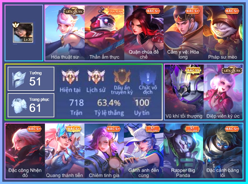 Valhein Hoàng tử Quạ, Valhein Thần tài, Valhein Xạ Thần, Valhein S-Quang Vinh, Triệu Vân Quý Công Tử, Krixi Công chúa Bướm, Krixi Cô Tiên Thỏ, Krixi Phó văn nghệ, Krixi Thuỷ Thủ, Gildur Đại gia học viện, Natalya Nghệ nhân lân, Natalya Quý Cô Thủy Tề, Veera Goá Phụ, Veera Y Tá Bạo Loạn, Veera Thiên nga đen, Mina Tiệc Bánh Kẹo, Điêu Thuyền Nữ Vương Anh Đào, Điêu Thuyền Mèo công nghệ, Ignis Bắc băng vương, Taara Đại tù trưởng, Taara Hỏa Ngọc Nữ Đế, Zephys Phi thương, Zephys Inosuke Hashibira, Stuart Gã hề, Amily Đặc cảnh NYPD, Amily Hội ám hoàng, Airi Thích Khách, Airi Đặc công tử điệp, Toro Bạch mao Ngưu, Mganga Hề cung đình, Mganga Pháp sư mèo, Kahlii Kim cô giáo chủ, Kahlii Siêu đầu bếp, Tulen Nhà Thám Hiểm, Tulen Phù Thủy Kiến Tạo, TeeMee Xiếc Cung Đình, Violet Nữ đặc cảnh, Violet Đặc Dị, Violet Tay Súng Siêu Phẩm, Violet Huy Chương Vàng, Raz Đại tù trưởng, Lữ Bố Kỵ Sĩ Âm Phủ, Lauriel Đọa Lạc Thiên Sứ, Grakk Thuyền Trưởng Râu Đỏ, Wisp Hải Tặc Nhí, Wisp Ếch nhồi bông, Ilumia Nữ Chúa Tuyết, Ilumia Thiên nữ áo dài, Ilumia Diva nổi loạn, Roxie Thám tử tập sự, Roxie kèn ái tình, Roxie Hầu gái, Roxie Lễ hội hoa, Roxie Hỏa thuật sư, Lindis Thám Tử Tư, Lindis Quang Vinh, Lindis Đồng phục Shihakusho, Sephera Quý tiểu thư, Sephera Thần tượng âm nhạc, Sephera Phi vụ thế kỷ, Sephera Thủy Liên Hoa, Xeniel Trung Vệ Thép, Zill Lốc Địa Ngục, Zill Dung nham, Keera Y tá lạ, Ryoma Đại Tướng Nguyệt Tộc, TelAnnas Cảnh Vệ Rừng, TelAnnas Chung Tình Tiễn, Telannas Dạ hội, TelAnnas Quang Vinh, Elandorr Soái tặc, Elandorr Phi vụ thế kỷ, Elandorr Học viện Carano, Veres Đạo tặc, Liliana thần tượng âm nhạc, Liliana Thuỷ thủ hồ ly, Hayate chiến binh trăng khuyết, Hayate Bạch lang, Laville Tay súng vô địch, Richter Dạ hội, Richter Quang vinh 2.0, Butterfly Teen Nữ Công Nghệ, Butterfly Gánh anh đến cùng, Darcy Nam tước, Darcy Pháp sư hỏa long, Fennik Nhà thám hiểm, Fennik Tiệc Bánh Kẹo, Dirak Quý tộc, Preyta Phi cơ F1, Murad Thiên Tài Sân Cỏ, Murad S-Quang Vinh, Marja Linh Xà Tư Tế, Maloch Ác Ma Địa Ngục, Maloch Samurai Tử Sĩ, Omega Hộ vệ ba bích, Dextra Quý cô Tuổi Dần, Paine khúc nhạc tử vong, Zuka Phát Tài, Zuka Đầu bếp hoàng cung, Zuka Rapper Big Panda, Ata Mèo đi mưa, Qi Thiếu nữ pháo hoa, Qi Blogger Ẩm thực, Capheny Toán Hóa Sinh, Errol Stream đến bao giờ, Yena Hoạt náo viên, Yena Nữ hoàng thể thao, Florentino Thần thoại Hy Lạp, Zip Cá siêu quậy, Aya Điệp viên ký ức, Alice Xứ sở thần tiên, Alice Dạ hội, Alice The Butterfly Mansion Girl, Enzo Thần thoại Hy Lạp, Enzo Nhà Leo núi, Ngộ Không Cổ thần Ai Cập, Kaine Người dơi, Thane Kẻ Hủy Diệt, Thane Mật vụ, Arum Quản lý tài năng, Rouie Quang Vinh, Azzenka Quang Vinh 2.0, Omen Thuyền trưởng hải tặc