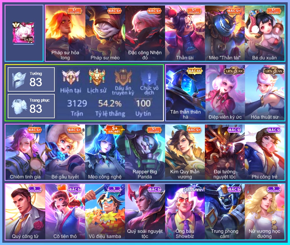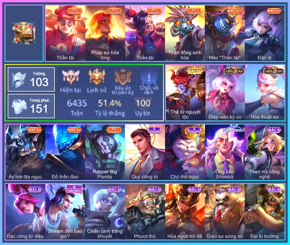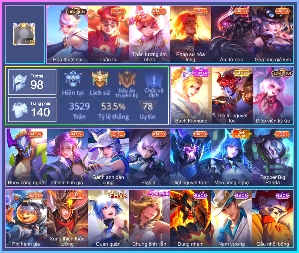 Valhein Hoàng tử Quạ, Valhein Thần tài, Valhein Xạ Thần, Valhein S-Quang Vinh, Triệu Vân Quý Công Tử, TelAnnas Cảnh Vệ Rừng, TelAnnas Chung Tình Tiễn, Telannas Dạ hội, TelAnnas Quang Vinh, Gildur phượt thủ, Gildur Đại võ sư, Mina Tiểu thư đoạt hồn, Mina Đào tạo siêu sao, Krixi Công chúa Bướm, Krixi Phó văn nghệ, Krixi Thuỷ Thủ, Toro Đặc cảnh NYPD, Butterfly Teen Nữ Công Nghệ, Butterfly Gánh anh đến cùng, Yorn Thế Tử Nguyệt Tộc, Yorn Soái ca bãi biển, Zephys Oán linh, Zephys Phi thương, Zephys Tư lệnh viễn chinh, Zephys Inosuke Hashibira, Natalya Quý Cô Thủy Tề, Kahlii Siêu đầu bếp, Alice Dạ hội, Alice The Butterfly Mansion Girl, Mganga Hề cung đình, Taara Hỏa Ngọc Nữ Đế, Teemee Tay đua siêu tốc, Thane Mật vụ, Roxie Thám tử tập sự, Roxie Hầu gái, Roxie Lễ hội hoa, Roxie Hỏa thuật sư, Veera Goá Phụ, Veera Thiên nga đen, Ilumia Nữ Chúa Tuyết, Kriknak Bọ Cánh Bạc, Zip Gà siêu quậy, Yena Hoạt náo viên, Yena Nữ hoàng thể thao, Yena Nữ cướp biển, Rouie Sứ giả vũ trụ, Rouie Quang Vinh, Ybneth Hạt trưởng kiểm lâm, Qi Quán quân, Qi Thiếu nữ pháo hoa, Qi Blogger Ẩm thực, Keera Y tá lạ, Keera Học viên Carano, Keera Thuỷ thủ, Fennik Nhà thám hiểm, Fennik Tiệc Bánh Kẹo, Fennik Phi hành gia, Preyta Không Tặc, Preyta Phi cơ F1, Enzo Thần thoại Hy Lạp, Enzo Nhà Leo núi, The Flash Tia chớp tương lai, Arthur Hoàng kim cốt, Arthur Lãnh chúa xương, Arthur Siêu sao Cricket, Darcy Pháp sư hỏa long, Ryoma Đại Tướng Nguyệt Tộc, Lumburr, Nakroth BBoy công nghệ, Hayate Bạch lang, Elandorr Soái tặc, Elandorr Học viện Carano, Điêu Thuyền Mèo công nghệ, Ignis Hỏa Thuật Sư, Ignis Bắc băng vương, Grakk Màu cờ sắc áo, Lauriel Nữ vương học đường 2, Errol Stream đến bao giờ, Richter Bá tước, Richter Dạ hội, Florentino Kiếm sĩ Olympic, Florentino Thần thoại Hy Lạp, Volkath Xung thiên thần tướng, Murad Thợ Săn Tiền Thưởng, Murad S-Quang Vinh, Laville Tay đua đường phố, Laville Tay súng vô địch, Baldum chú thợ ống nước, Dirak Quý tộc, Dirak Ông bầu Showbiz, Tulen Phù Thủy Kiến Tạo, Tulen Dạ hội, Zill Dung nham, Zill Diệt nguyệt tử sĩ, Violet Nữ đặc cảnh, Violet Đặc Dị, Violet Huy Chương Vàng, Zuka Đại Phú Ông, Zuka Gấu Nhồi Bông, Zuka Đầu bếp hoàng cung, Zuka Rapper Big Panda, Airi Bạch Kiemono, Airi Lễ hội mùa xuân, Omega Hộ vệ ba bích, Ngộ Không Đạo tặc, Ngộ Không Cổ thần Ai Cập, Ata Quang vinh, Ata Mèo đi mưa, Zata Tư lệnh viễn chinh, Sinestrea Lữ khách sa mạc, Superman Chúa Tể Công Lý, Aya Điệp viên ký ức, Amily Hội ám hoàng, Raz Đại tù trưởng, Lindis Thám Tử Tư, Lindis Đồng phục Shihakusho, Max Hiệp Sĩ Nhí, Liliana thần tượng âm nhạc, Liliana Thuỷ thủ hồ ly, Kaine Đôi Cánh Đại Dương, Kaine Người dơi, Dextra Quý cô Tuổi Dần, Slimz Xứ sở thần tiên, Slimz Thỏ nhồi bông, Slimz Lẩu chua cay, Slimz Sứ giả Thiên giới, Marja Linh Xà Tư Tế, Elsu Mafia, Rourke Cuồng tặc, Omen Ám tử đao, Omen Thuyền trưởng hải tặc, Sephera Chiêm tinh gia, Sephera Phi vụ thế kỷ, Sephera Thủy Liên Hoa, Azzenka Quang Vinh 2.0, Lữ Bố Nam Vương, Stuart Trò đùa tử vong, Stuart Gã hề, Xeniel Thiên Sứ Hủy Diệt, Arduin Tà linh hiệp sỹ