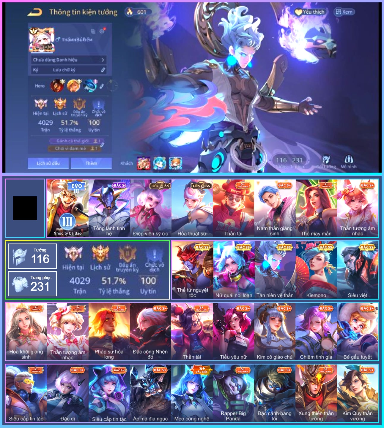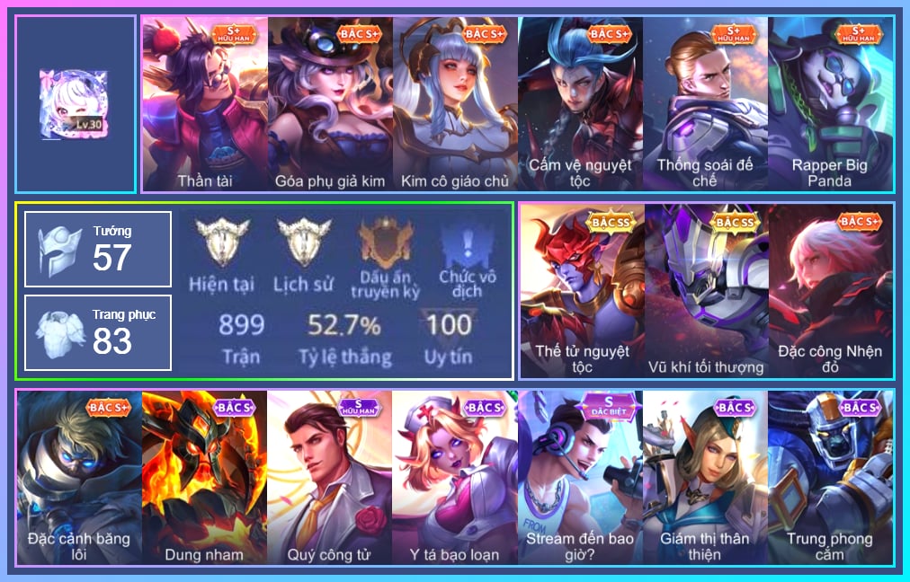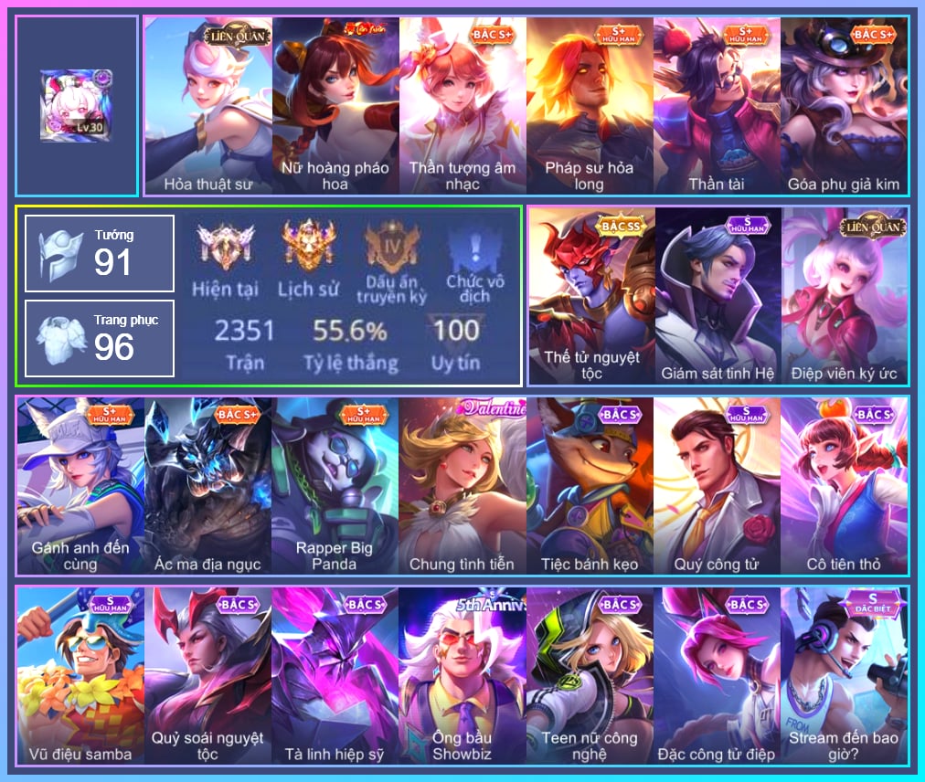 Valhein Hoàng tử Quạ, Valhein Quang Vinh, Valhein Số 7 Thần Sầu, Valhein Thần tài, Valhein Xạ Thần, Valhein S-Quang Vinh, Triệu Vân Quý Công Tử, Triệu Vân Thần Tài, Yorn Cung thủ bóng đêm, Yorn Soái ca bãi biển, Mganga Hề cung đình, Violet Nữ đặc cảnh, Violet Đặc Dị, Violet Tay Súng Siêu Phẩm, Violet Huy Chương Vàng, Violet Thần long tỷ tỷ, Gildur phượt thủ, Gildur Đại gia học viện, Cresht Thợ sửa cáp, Nakroth Chiến Binh Hỏa Ngục, Toro Đặc cảnh NYPD, Toro Bạch mao Ngưu, Veera Thiên nga đen, Butterfly Thủy thủ, Butterfly Teen Nữ Công Nghệ, Butterfly Gánh anh đến cùng, Taara Đại tù trưởng, Taara Hỏa Ngọc Nữ Đế, Mina Tiểu thư đoạt hồn, Mina Chị đại lắm chiêu, Mina Đào tạo siêu sao, Kahlii Siêu đầu bếp, Natalya Nghệ nhân lân, Natalya Quý Cô Thủy Tề, Arthur Hoàng kim cốt, Arthur Siêu sao Cricket, Chaugnar Quang Vinh, Thane Kẻ Hủy Diệt, Thane Mật vụ, Zephys Phi thương, Zephys Tư lệnh viễn chinh, Zephys Inosuke Hashibira, Zephys Đầu bếp Sashimi, Omega Người máy xanh, Omega Cỗ Máy Siêu Tốc, Omega Hộ vệ ba bích, Teemee Thịt xiên nướng, Wonder Woman Thế Chiến, Tulen Phù Thủy Kiến Tạo, Ngộ Không Đạo tặc, Ngộ Không Nhóc tỳ bá đạo, Ngộ Không Cổ thần Ai Cập, Azzenka Quang Vinh 2.0, Raz Đại tù trưởng, Raz Saitama Cosplay, Arduin, Fennik Nhà thám hiểm, Fennik Tay đua F1, Fennik Shipper Siêu thanh, Lumburr, Kriknak Bọ Cánh Bạc, Moren Anh thợ điện, Zuka Phát Tài, Zuka Gấu Nhồi Bông, Zuka Đầu bếp hoàng cung, Zuka Rapper Big Panda, Krixi Cô Tiên Thỏ, Krixi Phó văn nghệ, Krixi Thuỷ Thủ, Aleister Thiếu Niên Hắc Ám, Điêu Thuyền Nữ y tá, Điêu Thuyền Mèo công nghệ, Murad S-Quang Vinh, Jinna Đại Tư Tế, Grakk Khô Lâu Đại Tướng, Grakk Mèo thần tài, Grakk Màu cờ sắc áo, Alice Xứ sở thần tiên, Alice Dạ hội, Alice The Butterfly Mansion Girl, Ignis Hỏa Thuật Sư, Ignis Bắc băng vương, Ishar Giấc Mơ Ngọt Ngào, Volkath Tư lệnh viễn chinh, Stuart Trò đùa tử vong, Stuart Gã hề, Errol Diệt nguyệt tiên phong, Errol Stream đến bao giờ, Florentino Kiếm sĩ Olympic, Florentino Thần thoại Hy Lạp, Florentino SEVEN, Richter Bá tước, Richter Dạ hội, Richter Quang vinh 2.0, Ryoma Đại Tướng Nguyệt Tộc, Ryoma Dạ hội, Elandorr Phi vụ thế kỷ, Paine khúc nhạc tử vong, Hayate Bạch lang, Veres Đạo tặc, Veres Chị đại học đường, Veres Phù thủy trang điểm, Bright Soái ca thánh điện, Lauriel Đọa Lạc Thiên Sứ, Lauriel Hỏa Phượng Hoàng, Lauriel Nữ vương học đường 2, Dirak Quý tộc, Dirak Ông bầu Showbiz, Zata Tư lệnh viễn chinh, Maloch Ác Ma Địa Ngục, Maloch Ác nhân vô tuyến, Astrid Bạch Kiếm Tiểu Thư, Qi Tiểu long, Qi Quán quân, Qi Thiếu nữ pháo hoa, Qi Blogger Ẩm thực, Zill Lốc Địa Ngục, Zill Thần mộng mị, Arum Linh tượng vu nữ, Arum Nữ hoàng gấu xám, Lindis Đồng phục Shihakusho, Sinestrea Lữ khách sa mạc, Airi Thích Khách, Airi Đặc công tử điệp, Airi Lễ hội mùa xuân, Baldum chú thợ ống nước, TelAnnas Cảnh Vệ Rừng, TelAnnas Chung Tình Tiễn, Telannas Dạ hội, TelAnnas Quang Vinh, Krizzix Cún siêu quậy, Zip Cá siêu quậy, Zip Ông trùm giáng sinh, Capheny Hầu gái, Yena Khuyên Bạc, Yena Hoạt náo viên, Yena Nữ cướp biển, KilGroth Cảnh Vệ Biển, Quillen Trưởng ngoại khoa, Slimz Sứ giả Thiên giới, Enzo Thần thoại Hy Lạp, Enzo Nhà Leo núi, Amily Đặc cảnh NYPD, Amily Hội ám hoàng, Amily Nữ đội trưởng, Ata Quang vinh, Ata Mèo đi mưa, Keera Thuỷ thủ, Keera Nghệ sĩ Graffiti, Liliana thần tượng âm nhạc, Liliana Thuỷ thủ hồ ly, Ilumia Nữ Chúa Tuyết, Ilumia Diva nổi loạn, Ilumia Ngược dòng thời gian, Roxie Thám tử tập sự, Roxie kèn ái tình, Roxie Hầu gái, Roxie Lễ hội hoa, Dextra Chiến binh quyến rũ, Dextra Quý cô Tuổi Dần, Rourke Cuồng tặc, Marja Linh Xà Tư Tế, Omen Ám tử đao, Omen Thuyền trưởng hải tặc, Ybneth Hạt trưởng kiểm lâm, Sephera Thủy Liên Hoa, Rouie Quang Vinh, Max Hiệp Sĩ Nhí, Max Găng Tay Vàng, Max Chuyên gia đập hộp, Xeniel Thiên Sứ Hủy Diệt