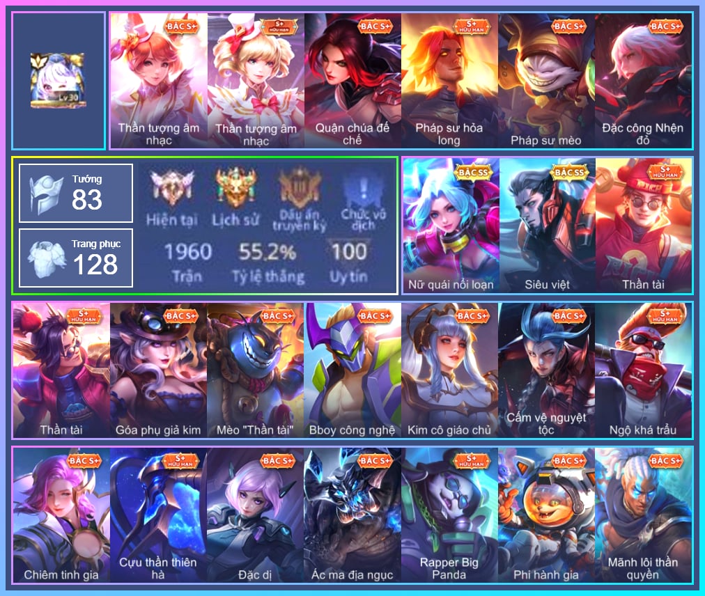 Valhein Hoàng tử Quạ, Valhein Thần tài, Valhein S-Quang Vinh, Triệu Vân Quý Công Tử, Triệu Vân Thần Tài, Mganga Pháp sư mèo, Gildur Đại gia học viện, Toro Trung Phong Cắm, Veera Goá Phụ, Alice Dạ hội, Alice The Butterfly Mansion Girl, Taara Đại tù trưởng, Taara Hỏa Ngọc Nữ Đế, Butterfly Thủy thủ, Butterfly Teen Nữ Công Nghệ, Butterfly Nữ Quái Nổi Loạn, Butterfly Quận Chúa Đế Chế, Krixi Cô Tiên Thỏ, Krixi Thuỷ Thủ, Murad Thợ Săn Tiền Thưởng, Murad Siêu việt, Murad S-Quang Vinh, Kahlii Kim cô giáo chủ, Kahlii Siêu đầu bếp, Lindis Quang Vinh, Sephera Chiêm tinh gia, Sephera Thủy Liên Hoa, TeeMee Xiếc Cung Đình, Teemee Tay đua siêu tốc, Arduin Quang Vinh, Arduin Tà linh hiệp sỹ, Zuka Giáo Sư Sừng Sỏ, Zuka Đầu bếp hoàng cung, Zuka Rapper Big Panda, Slimz Thỏ Thợ Mỏ, Kaine Đôi Cánh Đại Dương, Kaine Người dơi, Preyta Không Tặc, Preyta Phi cơ F1, Veres Đạo tặc, Liliana thần tượng âm nhạc, Liliana Thuỷ thủ hồ ly, Airi Thích Khách, Airi Cấm Vệ Nguyệt Tộc, Airi Đặc công tử điệp, Airi Lễ hội mùa xuân, Yena Nữ hoàng thể thao, Yena Nữ cướp biển, Hayate Bạch lang, Violet Nữ đặc cảnh, Violet Đặc Dị, Arthur Hoàng kim cốt, Arthur Siêu sao Cricket, Arthur Đặc cảnh băng lôi, Richter Bá tước, Richter Dạ hội, Richter Quang vinh 2.0, Volkath Dạ Huyết Tộc, TelAnnas Cảnh Vệ Rừng, TelAnnas Giám thị thân thiện, TelAnnas Chung Tình Tiễn, Telannas Thánh nữ mật hội, Telannas Dạ hội, TelAnnas Quang Vinh, Nakroth BBoy công nghệ, Zip Ông trùm giáng sinh, Elandorr Soái tặc, Elandorr Phi vụ thế kỷ, Keera Y tá lạ, Keera Thuỷ thủ, Max Hiệp Sĩ Nhí, Max Găng Tay Vàng, Max Quang Vinh, Ignis Hỏa Thuật Sư, Ignis Bắc băng vương, Capheny Thần tượng âm nhạc, Darcy Pháp sư hỏa long, Raz Đại tù trưởng, Raz Saitama Cosplay, Raz Mãnh lôi thần quyền, Điêu Thuyền Nữ Vương Anh Đào, Điêu Thuyền Hoa Hậu, Amily Đặc cảnh NYPD, Amily Đặc công nhện đỏ, Amily Hội ám hoàng, Amily Nữ đội trưởng, Ngộ Không Đạo tặc, Ngộ Không Ngộ Khá Trẩu, Ngộ Không Nhóc tỳ bá đạo, Ngộ Không Cổ thần Ai Cập, Zephys Tư lệnh viễn chinh, Rouie Quang Vinh, Natalya Nghệ nhân lân, Ormarr Cựu chiến binh, Fennik Tiệc Bánh Kẹo, Fennik Phi hành gia, Fennik Tay đua F1, Ryoma Đại Tướng Nguyệt Tộc, Enzo Nhà Leo núi, Laville Tay súng vô địch, Mina Đào tạo siêu sao, Grakk Thuyền Trưởng Râu Đỏ, Grakk Mèo thần tài, Grakk Màu cờ sắc áo, Thane Mật vụ, Zill Dung nham, Zill Cựu thần thiên hà, Dirak Quý tộc, Dirak Ông bầu Showbiz, Ata Quang vinh, Thorne Cận vệ hoàng gia, Tulen Phù Thủy Kiến Tạo, Sinestrea Lữ khách sa mạc, Baldum, Qi Thiếu nữ pháo hoa, Dextra Quý cô Tuổi Dần, Kriknak Bọ Cánh Bạc, Elsu Mafia, Aleister Quỷ soái nguyệt tộc, The Flash Tia chớp tương lai, Roxie Lễ hội hoa, Maloch Ác Ma Địa Ngục, Maloch Samurai Tử Sĩ, Maloch Ác nhân vô tuyến, Lorion Chiến giáp hắc ám, Annette Xứ sở thần tiên, Ilumia Diva nổi loạn, Azzenka Quang Vinh 2.0