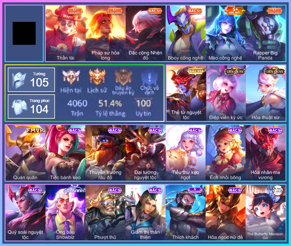 Valhein Hoàng tử Quạ, Valhein Số 7 Thần Sầu, Valhein Thần tài, Valhein S-Quang Vinh, Krixi Công chúa Bướm, Krixi Phó văn nghệ, Gildur phượt thủ, Gildur Đại võ sư, Grakk Thuyền Trưởng Râu Đỏ, Butterfly Thủy thủ, Toro Bạch mao Ngưu, Wisp Ếch nhồi bông, Maloch Ác nhân vô tuyến, Maloch Đại ca Mukbang, Kahlii Siêu đầu bếp, Annette Xứ sở thần tiên, Preyta Không Tặc, Yorn Thế Tử Nguyệt Tộc, TelAnnas Cảnh Vệ Rừng, TelAnnas Giám thị thân thiện, Telannas Dạ hội, TelAnnas Quang Vinh, Fennik Nhà thám hiểm, Fennik Đội đặc nhiệm, Laville Tay súng vô địch, Arduin, Amily Đặc công nhện đỏ, Amily Hội ám hoàng, Mina Tiệc Bánh Kẹo, Alice The Butterfly Mansion Girl, Natalya Quý Cô Thủy Tề, Kaine Người dơi, Lindis Thám Tử Tư, Lindis Đồng phục Shihakusho, Sinestrea Lữ khách sa mạc, Zephys Tư lệnh viễn chinh, Zephys Inosuke Hashibira, Zephys Đầu bếp Sashimi, Taara Hỏa Ngọc Nữ Đế, Slimz Thỏ Thợ Mỏ, Slimz Lẩu chua cay, Slimz Sứ giả Thiên giới, Thane Kẻ Hủy Diệt, Arum Nữ hoàng gấu xám, Paine khúc nhạc tử vong, Violet Nữ đặc cảnh, Violet Huy Chương Vàng, Zill Thần mộng mị, Richter Bá tước, Richter Quang vinh 2.0, Điêu Thuyền Nữ y tá, Điêu Thuyền Mèo công nghệ, Ilumia Diva nổi loạn, Zuka Đại Phú Ông, Zuka Phát Tài, Zuka Đầu bếp hoàng cung, Zuka Rapper Big Panda, Ignis Hỏa Thuật Sư, Airi Thích Khách, Airi Lễ hội mùa xuân, Nakroth BBoy công nghệ, Nakroth Quán quân, Yena Nữ hoàng thể thao, Yena Nữ cướp biển, Raz Đại tù trưởng, Ryoma Đại Tướng Nguyệt Tộc, Ryoma Dạ hội, Azzenka Quang Vinh 2.0, Tulen Nhà Thám Hiểm, Tulen Dạ hội, Errol Quái vật cương thi, Florentino Vũ kiếm sư, Florentino Kiếm sĩ Olympic, Omega Hộ vệ ba bích, Dirak Quý tộc, Dirak Ông bầu Showbiz, Dirak Đường chủ yêu giới, Ngộ Không Đạo tặc, Ngộ Không Cổ thần Ai Cập, Murad Thợ Săn Tiền Thưởng, Murad S-Quang Vinh, Aleister Quỷ soái nguyệt tộc, Darcy Pháp sư hỏa long, Kriknak Bọ Cánh Bạc, Jinna Hỏa nhãn ma vương, Lauriel Đọa Lạc Thiên Sứ, Ata Quang vinh, Hayate Bạch lang, Qi Thiếu nữ pháo hoa, Ishar Tiểu thư kẹo ngọt, Rouie Sứ giả vũ trụ, Rouie Quang Vinh, Moren Anh thợ điện, Dextra Quý cô Tuổi Dần, Bright Soái ca thánh điện, Zip Cá siêu quậy, Aya Điệp viên ký ức, Elandorr Phi vụ thế kỷ, Roxie Hầu gái, Roxie Lễ hội hoa, Roxie Hỏa thuật sư, Omen Sĩ Quan Viễn Chinh, Quillen Sao đỏ học đường, Rourke Cuồng tặc