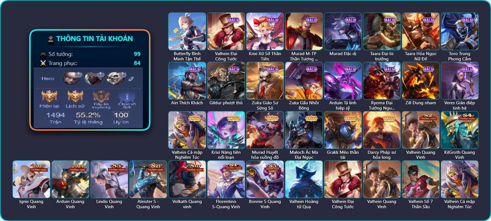 Arthur Đặc cảnh băng lôi, Krixi Phó văn nghệ, TelAnnas Giám thị thân thiện, TelAnnas Quang Vinh, Valhein Hoàng tử Quạ, Valhein Xạ Thần, Valhein S-Quang Vinh, Butterfly Thủy thủ, Butterfly Quận Chúa Đế Chế, Butterfly Bình Minh Tận Thế, Violet Nữ đặc cảnh, Violet Phi Công Trẻ, Violet Đặc Dị, Violet Tay Súng Siêu Phẩm, Allain Lân sư Vũ thần, Zuka Phát Tài, Zuka Đầu bếp hoàng cung, Zuka Xích Hùng Chiến Giáp, Natalya Quý Cô Thủy Tề, Natalya Băng tâm thần nữ, Lữ Bố Nam Vương, Lữ Bố Hoả Long Chiến Thần, Omen Sĩ Quan Viễn Chinh, Omen Ám tử đao, Omen Chiến binh trăng khuyết, Omen Thuyền trưởng hải tặc, Triệu Vân Quý Công Tử, Alice Nhà chiêm tinh, Alice Bé Gấu Tuyết, Alice Xứ sở thần tiên, Maloch Ác Ma Địa Ngục, Maloch Samurai Tử Sĩ, Maloch Ác nhân vô tuyến, Maloch Đại ca Mukbang, Veera Phù thủy Hội họa, Slimz Lẩu chua cay, Slimz Sứ giả Thiên giới, Slimz Siêu Cấp Tối Thượng, Stuart Vua hề, Stuart Gã hề, Grakk Sumo, Grakk Màu cờ sắc áo, Grakk Thần ẩm thực, Yorn Đặc Nhiệm Swat, Yorn Soái ca bãi biển, Hayate Quỷ diện, Hayate Bạch lang, Amily Đặc cảnh NYPD, Amily Nữ đội trưởng, Amily Thám tử trung học, Mganga Doombot Hủy Diệt, Kahlii Siêu đầu bếp, Kahlii Rối Nước Thuỷ Đình, Laville Kim quy thần vương, Laville Thám tử học đường, Ngộ Không Cổ thần Ai Cập, Roxie Hầu gái, Roxie Hỏa thuật sư, Ilumia Diva nổi loạn, Ilumia Ngược dòng thời gian, Aleister S - Quang Vinh, Mina Tiệc Bánh Kẹo, Mina Đào tạo siêu sao, Omega Hộ Vệ Carano, Tulen Phù Thủy Kiến Tạo, Tulen Tân niên vệ thần, Rouie Quang Vinh, Thane Khoảnh khắc vinh quang, Azzenka Quang Vinh 2.0, Qi Đặc vụ cáo tuyết, Qi Blogger Ẩm thực, Helen Ngủ trong rừng, Veres Thần thoại Hy Lạp, Toro Trung Phong Cắm, Florentino Thần thoại Hy Lạp, Florentino S-Quang Vinh, Zill Diệt nguyệt tử sĩ, Zill Thần mộng mị, Quillen Trưởng ngoại khoa, Quillen Sao đỏ học đường, Quillen Giám đốc âm nhạc, Quillen Huyết phong, Enzo Nhà Leo núi, Raz Đại tù trưởng, Raz Siêu cấp tin tặc, Taara Hỏa Ngọc Nữ Đế, Yena Nữ cướp biển, Yena Hoa tiêu Mộng giới, Nakroth Producer Tia chớp, Nakroth Siêu Việt 1, Richter Bá tước, Richter Quang vinh 2.0, Richter Cứu hộ, Sephera Thủy Liên Hoa, Errol Stream đến bao giờ, Kaine Thợ Săn Chính Nghĩa, Bright Soái ca thánh điện, Bright Kỳ Lân Soái, Ryoma Dạ hội, Volkath Tư lệnh viễn chinh, Volkath Quang vinh, Lauriel Đọa Lạc Thiên Sứ, Lauriel Nữ vương học đường 2, Murad M-TP Thần Tượng Học Đường, Murad Đồ thần đao, Murad S-Quang Vinh, Fennik Nhà thám hiểm, Fennik Đội đặc nhiệm, Fennik Tay đua F1, Capheny S-Quang Vinh, Kriknak Bọ Cánh Bạc, Kriknak ST.L-162, Celica Nữ cao bồi, Celica S-Quang Vinh, Celica Tâm hồn trà sữa, Điêu thuyền Vũ điệu nghê thường, Airi Kiemono, Airi Đặc công tử điệp, Tachi Lãng khách, Tachi Đao khách vô tình, Max Tiểu King Kong, Elsu Xạ Thần Mộng Giới, Aya Điệp viên ký ức, Lorion Chiến giáp hắc ám, Zip Ông trùm giáng sinh, Darcy Pháp sư hỏa long, DArcy Tiến sĩ thiên tài, Dextra Lữ khách cao nguyên, Arum Nữ hoàng gấu xám, Arum Thần tượng nhạc Rock, Liliana thần tượng âm nhạc, Liliana Thuỷ thủ hồ ly, Dirak Ông bầu Showbiz, Sinestrea S-Quang vinh, Thorne Ước nguyện giáng sinh, Thorne Thám tử trung học, Dolia Môn đồ tập sự, Astrid Hoa anh đào, Krizzix Crursed Corpse, Yan nhà chế tác, Bonnie S Quang Vinh, Arduin Tà linh hiệp sỹ, Paine khúc nhạc tử vong, Ignis Vì sao con khóc, Ishar Capoo Boom