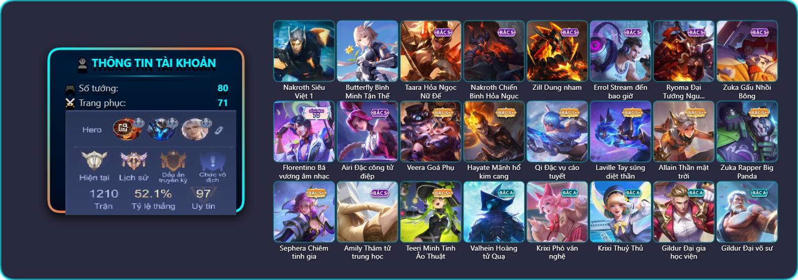 Valhein Hoàng tử Quạ, Valhein S-Quang Vinh, Triệu Vân Quý Công Tử, Krixi Phó văn nghệ, Krixi Thần Thoại Hy Lạp, Krixi Thuỷ Thủ, Taara Hỏa Ngọc Nữ Đế, Taara Tư lệnh hải âu, TelAnnas Cảnh Vệ Rừng, Telannas Thánh nữ mật hội, Telannas Dạ hội, TelAnnas Quang Vinh, Violet Nữ đặc cảnh, Violet Phó học tập, Violet Huy Chương Vàng, Zephys Tư lệnh viễn chinh, Zephys Đầu bếp Sashimi, Gildur Đại gia học viện, Celica S-Quang Vinh, Yena Nữ hoàng thể thao, Qi Thiếu nữ pháo hoa, Zip Cá siêu quậy, Dirak Quý tộc, Bright Soái ca thánh điện, Murad Thợ Săn Tiền Thưởng, Murad Điệp viên Anubis, Zuka Gấu Nhồi Bông, Zuka Đầu bếp hoàng cung, Amily Hội ám hoàng, Florentino Vũ kiếm sư, Airi Thích Khách, Capheny S-Quang Vinh, Skud Sơn Tặc, Raz Đại tù trưởng, Raz Saitama Cosplay, Zill Thần mộng mị, Ata Quang vinh, Ata Giao Long, Arthur Hoàng kim cốt, Arthur Siêu sao Cricket, Slimz Thỏ Thợ Mỏ, Sinestrea S-Quang vinh, Aleister Quỷ soái nguyệt tộc, Aleister S - Quang Vinh, Ngộ Không Đạo tặc, Ngộ Không Cổ thần Ai Cập, Arum Nữ hoàng gấu xám, Lindis Đồng phục Shihakusho, Kriknak Bọ Cánh Bạc, Lữ Bố Vũ điệu Samba, Dextra Quý cô Tuổi Dần, Butterfly Teen Nữ Công Nghệ, Butterfly Quận Chúa Đế Chế, Tulen Phù Thủy Kiến Tạo, Veera Thiên nga đen, Roxie Lễ hội hoa, Annette Xứ sở thần tiên, Azzenka Quang Vinh 2.0, Quillen Trưởng ngoại khoa, Baldum Đồ chơi, Bijan Giai Điệu Giáng Sinh, Ryoma Ailing Samurai, Omen Sĩ Quan Viễn Chinh, Teeri Minh Tinh Ảo Thuật