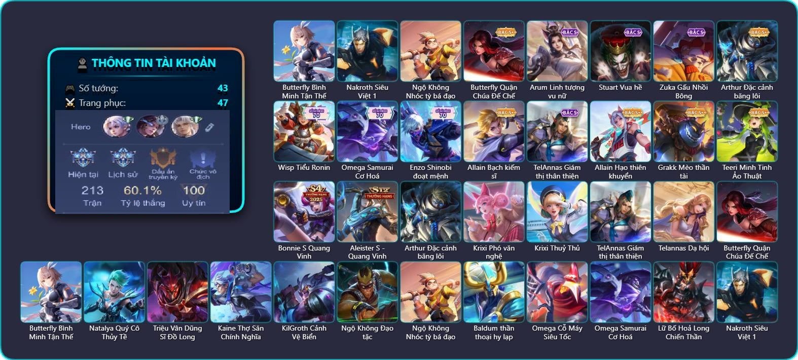 Valhein Hoàng tử Quạ, Valhein Thần tài, Krixi Xứ Sở Thần Tiên, Krixi Thuỷ Thủ, Mganga Doombot Hủy Diệt, Butterfly Teen Nữ Công Nghệ, Butterfly Bình Minh Tận Thế, Taara Hỏa Ngọc Nữ Đế, Mina Chị đại lắm chiêu, Kahlii Rối Nước Thuỷ Đình, Violet Nữ đặc cảnh, Violet Tay Súng Siêu Phẩm, Alice Bé Gấu Tuyết, Zephys Siêu việt, Maloch Đại Tướng Robot, Amily Đặc công nhện đỏ, Amily Hội ám hoàng, Amily Thám tử trung học, Kaine Thợ Săn Chính Nghĩa, Veera Goá Phụ, Murad M-TP Thần Tượng Học Đường, TelAnnas Cảnh Vệ Rừng, Telannas Dạ hội, Natalya Quý Cô Thủy Tề, Điêu Thuyền Nữ y tá, Điêu Thuyền Hoa Hậu, Điêu Thuyền Mèo công nghệ, Ishar Giấc Mơ Ngọt Ngào, Ishar Capoo Boom, Ata Quang vinh, Airi Quái xế công nghệ, Hayate Quỷ diện, Qi Thiếu nữ pháo hoa, Ilumia Nữ Chúa Tuyết, Max Trà Chanh, Raz Saitama Cosplay, Errol Diệt nguyệt tiên phong, Capheny Thần tượng âm nhạc, Arum Nữ hoàng gấu xám, Keera Học viên Carano, Roxie Hầu gái, Liliana Hồ Quý Phi, Elsu Xạ Thần Mộng Giới, Florentino Vũ kiếm sư, Florentino Giám sát tinh hệ, Florentino S-Quang Vinh, Omen Sĩ Quan Viễn Chinh, Omen Thuyền trưởng hải tặc, Nakroth BBoy công nghệ, Xeniel Kim sí điểu, Laville Tay đua đường phố, Laville Tay súng diệt thần, Laville Xạ Thần Tinh Vệ, Ming thầy tướng, Bright Soái ca thánh điện, Bright Kỳ Lân Soái, Volkath Quang vinh, Bijan Hoàng kim cơ giáp, Ryoma Đại Tướng Nguyệt Tộc, Ryoma Dạ hội, Thane Mật vụ, Astrid Hoa anh đào, Veres Thần thoại Hy Lạp, Tulen Phó kỷ luật, Krizzix Crursed Corpse, Yan nhà chế tác, Enzo Phẩm chất quý tộc, Zuka Gấu Nhồi Bông, Zuka Xích Hùng Chiến Giáp, Ybneth Hạt trưởng kiểm lâm, Ybneth Candy Bear, Tachi S-Vinh Quang, Bonnie S Quang Vinh, Aleister S - Quang Vinh