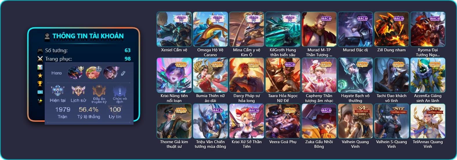 Valhein Quang Vinh, Valhein S-Quang Vinh, Triệu Vân Chiến tướng mùa đông, Mganga Doombot Hủy Diệt, Gildur Đại gia học viện, TelAnnas Chung Tình Tiễn, Telannas Thánh nữ mật hội, Telannas Dạ hội, TelAnnas Quang Vinh, KilGroth Quang Vinh, KilGroth Hung thần biển sâu, Violet Nữ đặc cảnh, Violet Phó học tập, Violet Tay Súng Siêu Phẩm, Violet Huy Chương Vàng, Chaugnar Ác Mộng Sinh Hóa, Chaugnar Quang Vinh, Zuka Đại Phú Ông, Zuka Gấu Nhồi Bông, Zuka Đầu bếp hoàng cung, Krixi Xứ Sở Thần Tiên, Krixi Phó văn nghệ, Krixi Thần Thoại Hy Lạp, Krixi Nàng tiên nổi loạn, Zephys Phi thương, Stuart Trò đùa tử vong, Stuart Gã hề, Nakroth Quán quân, Airi Lễ hội mùa xuân, Taara Hỏa Ngọc Nữ Đế, Skud Quang Vinh, Ignis Quang Vinh, Yorn Cung thủ bóng đêm, Murad Thợ Săn Tiền Thưởng, Murad M-TP Thần Tượng Học Đường, Murad Đặc dị, Murad S-Quang Vinh, Zill Dung nham, Zill Thần mộng mị, Slimz Thỏ nhồi bông, Slimz Siêu Cấp Tối Thượng, Kriknak Bọ Cánh Bạc, Ilumia Thiên nữ áo dài, Grakk Khô Lâu Đại Tướng, Grakk Thần ẩm thực, Lindis Quang Vinh, Kahlii Rối Nước Thuỷ Đình, Arduin Quang Vinh, Sephera Quý tiểu thư, Max Quang Vinh, Yena Hoa tiêu Mộng giới, Florentino Kiếm sĩ Olympic, Florentino S-Quang Vinh, Darcy Pháp sư hỏa long, Preyta Phi cơ F1, Dirak Quý tộc, Keera Hồ điệp, Keera Quán Quân, Enzo Phẩm chất quý tộc, Wisp Hải Tặc Nhí, Wisp Cô bé bút chì, Veera Goá Phụ, Elandorr Phi vụ thế kỷ, Elandorr Học viện Carano, Capheny Thần tượng âm nhạc, Capheny S-Quang Vinh, Ryoma Đại Tướng Nguyệt Tộc, Laville Tay súng vô địch, Quillen Trưởng ngoại khoa, Raz Đại tù trưởng, Raz MC Võ đài, Thane Kẻ Hủy Diệt, Mina Cẩm y vệ Kim Ô, Hayate Bạch ảnh, Hayate Bạch vô thường, Richter Quang vinh 2.0, Ata Quang vinh, Ybneth Candy Bear, Tachi Đao khách vô tình, Điêu Thuyền Nữ y tá, Arthur Siêu sao Cricket, Azzenka Quang Vinh 2.0, AzzenKa Giáng sinh An lành, Annette Xứ sở thần tiên, Celica S-Quang Vinh, Elsu Xạ Thần Mộng Giới, Omega Hộ Vệ Carano, Sinestrea S-Quang vinh, Kaine Thợ Săn Chính Nghĩa, Marja Linh Xà Tư Tế, Volkath Quang vinh, Xeniel Thiên Sứ Hủy Diệt, Xeniel Cẩm vệ, Liliana Thuỷ thủ hồ ly, Omen Sĩ Quan Viễn Chinh, Bonnie S Quang Vinh, Thorne Giả kim thuật sư, Aleister S - Quang Vinh