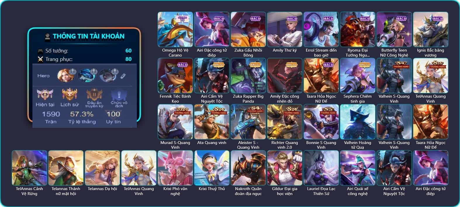 Valhein Hoàng tử Quạ, Valhein S-Quang Vinh, Taara Hỏa Ngọc Nữ Đế, TelAnnas Cảnh Vệ Rừng, Telannas Thánh nữ mật hội, Telannas Dạ hội, TelAnnas Quang Vinh, Krixi Phó văn nghệ, Krixi Thuỷ Thủ, Nakroth Quân đoàn địa ngục, Gildur Đại gia học viện, Lauriel Đọa Lạc Thiên Sứ, Airi Quái xế công nghệ, Airi Cấm Vệ Nguyệt Tộc, Airi Đặc công tử điệp, Airi Lễ hội mùa xuân, Airi Quản lý tài năng, Zuka Phát Tài, Zuka Gấu Nhồi Bông, Zuka Đầu bếp hoàng cung, Zuka Rapper Big Panda, Elandorr Phi vụ thế kỷ, Violet Nữ đặc cảnh, Violet Phó học tập, Violet Huy Chương Vàng, Omega Hộ Vệ Carano, Amily Đặc công nhện đỏ, Amily Thư ký, Amily Hội ám hoàng, Thane Kẻ Hủy Diệt, Tulen Dạ hội, Laville Tay đua đường phố, Laville Tay súng vô địch, Errol Vượt ngục, Errol Stream đến bao giờ, Dirak Quý tộc, Yorn Cung thủ bóng đêm, Yorn Soái ca bãi biển, Hayate Bạch ảnh, Hayate Bạch lang, Mganga Quái tặc không gian, Murad Thợ Săn Tiền Thưởng, Murad S-Quang Vinh, Ngộ Không Đạo tặc, Ngộ Không Cổ thần Ai Cập, Ryoma Thợ Săn Tiền Thưởng, Ryoma Đại Tướng Nguyệt Tộc, Veres Đạo tặc, Ata Quang vinh, Maloch Đại ca Mukbang, Qi Thiếu nữ pháo hoa, KilGroth Cảnh Vệ Biển, Butterfly Teen Nữ Công Nghệ, Mina Tiệc Bánh Kẹo, Mina Đào tạo siêu sao, Aleister S - Quang Vinh, Zip Cá siêu quậy, Raz Đại tù trưởng, Teemee Thịt xiên nướng, Roxie Lễ hội hoa, Sephera Chiêm tinh gia, Sephera Thủy Liên Hoa, Omen Sĩ Quan Viễn Chinh, Grakk Khô Lâu Đại Tướng, Arthur Siêu sao Cricket, Alice Xứ sở thần tiên, Alice The Butterfly Mansion Girl, Richter Quang vinh 2.0, Liliana Thuỷ thủ hồ ly, Ilumia Ngược dòng thời gian, Ignis Bắc băng vương, Keera Nghệ sĩ Graffiti, Celica Tâm hồn trà sữa, Fennik Tiệc Bánh Kẹo, Bright Kỳ Lân Soái, Annette Xứ sở thần tiên, Capheny Hầu gái, Bonnie S Quang Vinh, Enzo Phẩm chất quý tộc, Bijan Giai Điệu Giáng Sinh
