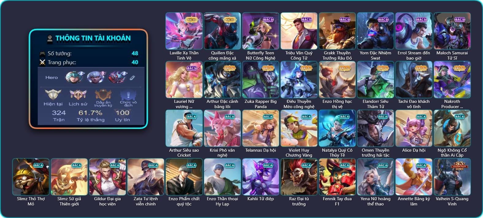 Valhein Hoàng tử Quạ, Valhein Số 7 Thần Sầu, Valhein Xạ Thần, Valhein S-Quang Vinh, Triệu Vân Quý Công Tử, Krixi Phó văn nghệ, Krixi Thần Thoại Hy Lạp, Krixi Thuỷ Thủ, Veera Cô giáo hắc ám, Yorn Soái ca bãi biển, Gildur phượt thủ, Gildur Đại gia học viện, Mina Tiệc Bánh Kẹo, Mina Đào tạo siêu sao, Maloch Ác Ma Địa Ngục, Maloch Ác nhân vô tuyến, Maloch Đại ca Mukbang, Kriknak Bọ Cánh Bạc, Natalya Quý Cô Thủy Tề, Mganga Doombot Hủy Diệt, Kahlii Kim cô giáo chủ, Kahlii Siêu đầu bếp, Kahlii Tử điệp, Taara Hỏa Ngọc Nữ Đế, Errol Đêm Ác Mộng, Errol Stream đến bao giờ, Veres Đạo tặc, Veres Chị đại học đường, TelAnnas Giám thị thân thiện, Telannas Thánh nữ mật hội, Telannas Dạ hội, TelAnnas Quang Vinh, Kaine Thợ Săn Chính Nghĩa, Enzo Phẩm chất quý tộc, Enzo Thần thoại Hy Lạp, Enzo Nhà Leo núi, Keera Học viên Carano, Keera Nghệ sĩ Graffiti, Murad Thợ Săn Tiền Thưởng, Murad S-Quang Vinh, Nakroth Producer Tia chớp, Elandorr Phi vụ thế kỷ, Elandorr Học viện Carano, Alice Nhà chiêm tinh, Alice Xứ sở thần tiên, Alice The Butterfly Mansion Girl, Ngộ Không Nhóc tỳ bá đạo, Ngộ Không Cổ thần Ai Cập, Zip Cá siêu quậy, Yena Khuyên Bạc, Yena Nữ hoàng thể thao, Yena Nữ cướp biển, Yena Hoa tiêu Mộng giới, Hayate Bạch ảnh, Hayate Bạch lang, Qi Thiếu nữ pháo hoa, Qi Blogger Ẩm thực, Darcy Pháp sư hỏa long, Florentino Vũ kiếm sư, Florentino Giám sát tinh hệ, Florentino Kiếm sĩ Olympic, Florentino Thần thoại Hy Lạp, Florentino Hisoka, Max Hiệp Sĩ Nhí, Max Quang Vinh, Violet Nữ đặc cảnh, Violet Phó học tập, Violet Đặc Dị, Violet Huy Chương Vàng, Teemee Tay đua siêu tốc, Teemee Thịt xiên nướng, Preyta Không Tặc, Preyta Băng Hỏa Long Sư, Preyta Phi cơ F1, Raz Đại tù trưởng, Ryoma Thợ Săn Tiền Thưởng, Ryoma Đại Tướng Nguyệt Tộc, Fennik Nhà thám hiểm, Fennik Tiệc Bánh Kẹo, Wisp Hải Tặc Nhí, Grakk Khô Lâu Đại Tướng, Grakk Mèo thần tài, Grakk Màu cờ sắc áo, Điêu Thuyền Nữ Vương Anh Đào, Điêu thuyền Vũ điệu nghê thường, Richter Dạ hội, Richter Quang vinh 2.0, Capheny Toán Hóa Sinh, Zephys Phi thương, Thane Kẻ Hủy Diệt, Thane Mật vụ, Lauriel Đọa Lạc Thiên Sứ, Lauriel Nữ vương học đường 2, Lindis Thám Tử Tư, Lindis Đồng phục Shihakusho, Zuka Phát Tài, Zuka Gấu Nhồi Bông, Zuka Đầu bếp hoàng cung, Zuka Rapper Big Panda, Omen Sĩ Quan Viễn Chinh, Omen Ám tử đao, Laville Tay đua đường phố, Laville Tay súng vô địch, Laville Thám tử học đường, Sephera Chiêm tinh gia, Sephera Phi vụ thế kỷ, Sephera Thủy Liên Hoa, Lữ Bố Nam Vương, Lữ Bố Kỵ Sĩ Âm Phủ, KilGroth Cảnh Vệ Biển, Zill Lốc Địa Ngục, Zill Dung nham, Zill Diệt nguyệt tử sĩ, Zill Thần mộng mị, Lorion Chiến giáp hắc ám, Quillen Trưởng ngoại khoa, Astrid Bạch Kiếm Tiểu Thư, Astrid Siêu sao bóng chày, Omega Cỗ Máy Siêu Tốc, Omega Hộ Vệ Carano, Butterfly Teen Nữ Công Nghệ, Butterfly Nữ Quái Nổi Loạn, Butterfly Quận Chúa Đế Chế, Butterfly Gánh anh đến cùng, Butterfly Bình Minh Tận Thế, Paine khúc nhạc tử vong, Slimz Thỏ Thợ Mỏ, Slimz Sứ giả Thiên giới, Marja Linh Xà Tư Tế, Ata Quang vinh, Ata Mèo đi mưa, Tulen Dạ hội, Moren Anh thợ điện, Thorne Giả kim thuật sư, Amily Đặc cảnh NYPD, Amily Đặc công nhện đỏ, Amily Hội ám hoàng, Amily Nữ đội trưởng, Arduin, Arduin Tà linh hiệp sỹ, Arum Nữ hoàng gấu xám, Dextra Quý cô Tuổi Dần, Airi Đặc công tử điệp, Airi Quản lý tài năng, Annette Xứ sở thần tiên, Roxie Lễ hội hoa, Roxie Hỏa thuật sư, Liliana Hồ Quý Phi, Liliana thần tượng âm nhạc, Liliana Thuỷ thủ hồ ly, Aya Điệp viên ký ức, Tachi Đao khách vô tình, Rouie Quang Vinh, Stuart Trò đùa tử vong, Stuart Gã hề, Ilumia Nữ Chúa Tuyết, Ilumia Diva nổi loạn, Ilumia Ngược dòng thời gian, Ishar Giấc Mơ Ngọt Ngào, Sinestrea S-Quang vinh, Bright Kỳ Lân Soái, Azzenka Quang Vinh 2.0, Bijan Giai Điệu Giáng Sinh, Xeniel Thiên Sứ Hủy Diệt, Xeniel Trung Vệ Thép, Arthur Hoàng kim cốt, Arthur Siêu sao Cricket, Bonnie S Quang Vinh, Ignis Hỏa Thuật Sư, Aleister S - Quang Vinh