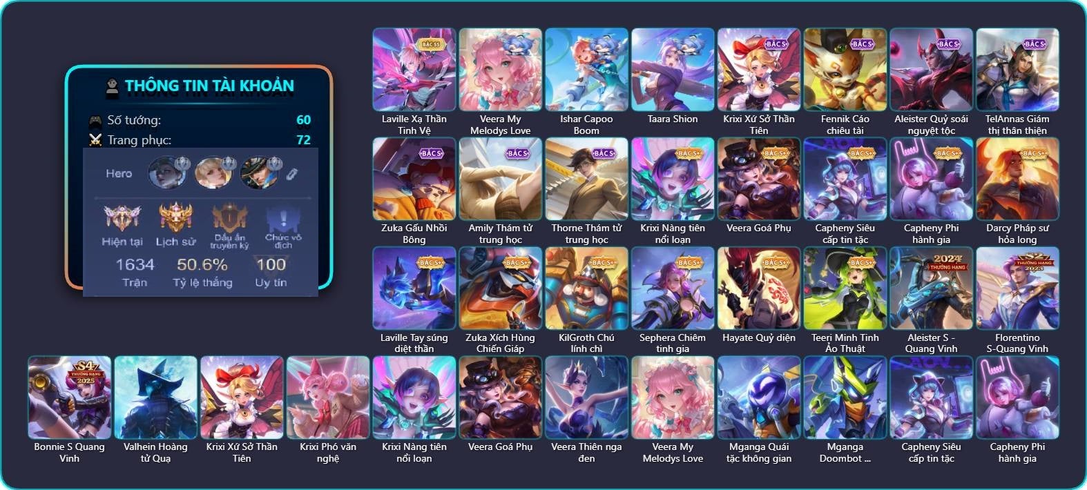 Valhein Hoàng tử Quạ, Valhein S-Quang Vinh, Triệu Vân Quý Công Tử, Krixi Thuỷ Thủ, Keera Học viên Carano, Keera Hồ điệp, Violet Huy Chương Vàng, Moren Anh thợ điện, Laville Tay súng vô địch, Airi Thích Khách, Airi Đặc công tử điệp, Airi Lễ hội mùa xuân, Airi Quản lý tài năng, Elandorr Phi vụ thế kỷ, KilGroth Cảnh Vệ Biển, Raz Đại tù trưởng, Raz Băng Quyền Quán Quân, Zephys Phi thương, Zephys Tư lệnh viễn chinh, Zephys Inosuke Hashibira, Ryoma Đại Tướng Nguyệt Tộc, Maloch Ác nhân vô tuyến, Hayate Bạch lang, Wisp Tiểu Ronin, Celica S-Quang Vinh, Max Chuyên gia đập hộp, Dirak Cảnh Vệ Bầu Trời, Zill Dung nham, Zill Thần mộng mị, Điêu Thuyền Nữ Vương Anh Đào, Bright Kỳ Lân Soái, Nakroth Producer Tia chớp, Nakroth Siêu Việt 1, Allain Lân sư Vũ thần, Murad S-Quang Vinh, Enzo Chiến binh trăng khuyết, Kriknak Bọ Hoàng Kim, Butterfly Teen Nữ Công Nghệ, Butterfly Gánh anh đến cùng, Tachi Đao khách vô tình, Sephera Chiêm tinh gia, Capheny S-Quang Vinh, Veera Goá Phụ, Amily Đặc công nhện đỏ, Arthur Siêu sao Cricket, Elsu Xạ Thần Mộng Giới, Roxie Hầu gái, Roxie Lễ hội hoa, Telannas Dạ hội, Ngộ Không Cổ thần Ai Cập, Annette Xứ sở thần tiên, Omega Hộ vệ ba bích, Zuka Gấu Nhồi Bông, Zuka Rapper Big Panda, Rouie Quang Vinh, Taara Hồng môn đường chủ, Yena Nữ cướp biển, Yena Hoa tiêu Mộng giới, Liliana Thuỷ thủ hồ ly, Grakk Khô Lâu Đại Tướng, Grakk Thần ẩm thực, Xeniel Shipper bánh mỳ, Baldum Đồ chơi, Ilumia Diva nổi loạn, Arum Thần tượng nhạc Rock, Omen Sĩ Quan Viễn Chinh, Bonnie S Quang Vinh, AzzenKa Giáng sinh An lành, Aleister S - Quang Vinh, Teeri Minh Tinh Ảo Thuật, Bijan Giai Điệu Giáng Sinh