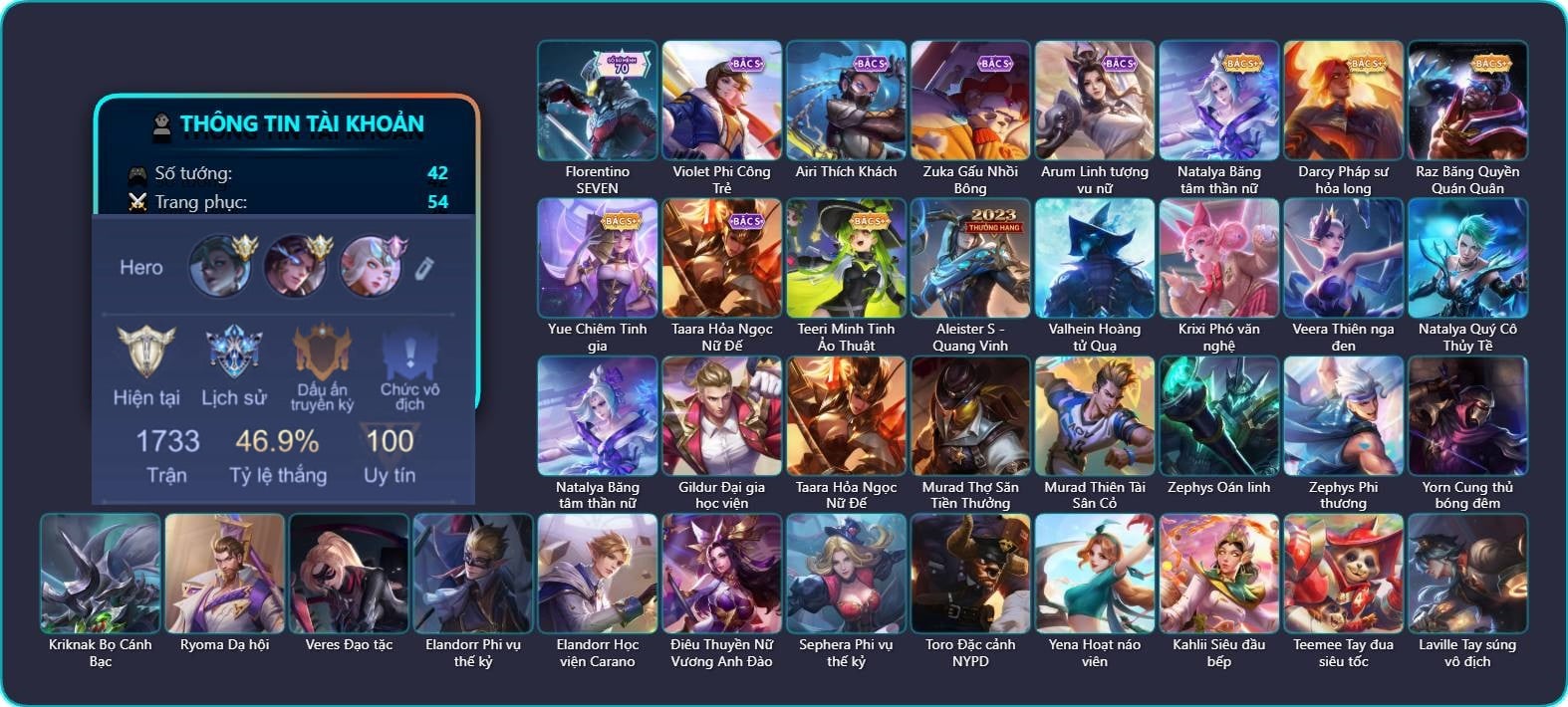 Valhein Hoàng tử Quạ, Krixi Phó văn nghệ, Veera Thiên nga đen, Natalya Quý Cô Thủy Tề, Natalya Băng tâm thần nữ, Gildur Đại gia học viện, Taara Hỏa Ngọc Nữ Đế, Murad Thợ Săn Tiền Thưởng, Murad Thiên Tài Sân Cỏ, Zephys Oán linh, Zephys Phi thương, Yorn Cung thủ bóng đêm, Kriknak Bọ Cánh Bạc, Ryoma Dạ hội, Veres Đạo tặc, Elandorr Phi vụ thế kỷ, Elandorr Học viện Carano, Điêu Thuyền Nữ Vương Anh Đào, Sephera Phi vụ thế kỷ, Toro Đặc cảnh NYPD, Yena Hoạt náo viên, Kahlii Siêu đầu bếp, Teemee Tay đua siêu tốc, Laville Tay súng vô địch, Violet Nữ đặc cảnh, Violet Phi Công Trẻ, Violet Phó học tập, Liliana Hồ Quý Phi, Darcy Pháp sư hỏa long, Preyta Phi cơ F1, Aleister S - Quang Vinh, Hayate Bạch ảnh, Arthur Lãnh chúa xương, Azzenka U Hồn Sa Mạc, Lauriel Đọa Lạc Thiên Sứ, Airi Thích Khách, Airi Quản lý tài năng, Zuka Đại Phú Ông, Zuka Gấu Nhồi Bông, Florentino SEVEN, Annette Xứ sở thần tiên, Enzo Thần thoại Hy Lạp, Astrid Bạch Kiếm Tiểu Thư, TelAnnas Cảnh Vệ Rừng, Thane Kẻ Hủy Diệt, Maloch Ác nhân vô tuyến, Arduin, Raz Băng Quyền Quán Quân, Zill Thần mộng mị, Butterfly Thủy thủ, Yue Chiêm Tinh gia, Arum Linh tượng vu nữ, Teeri Minh Tinh Ảo Thuật, Bijan Giai Điệu Giáng Sinh