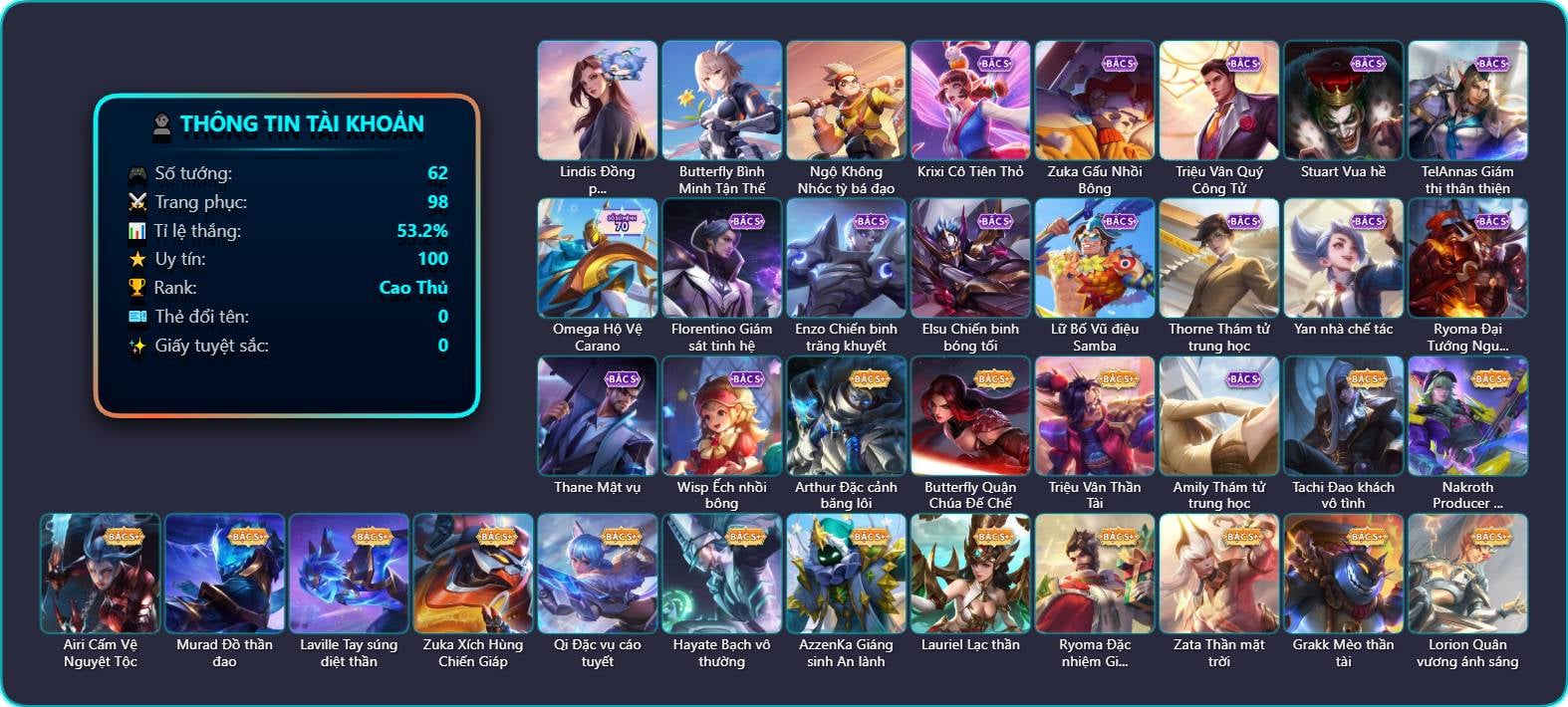 Arthur Đặc cảnh băng lôi, Krixi Cô Tiên Thỏ, Krixi Phó văn nghệ, Krixi Thuỷ Thủ, TelAnnas Giám thị thân thiện, Telannas Dạ hội, Tel Annas Jujutsu Sorcerer, Valhein Hoàng tử Quạ, Valhein Khiêu chiến, Violet Huy Chương Vàng, Butterfly Quận Chúa Đế Chế, Butterfly Bình Minh Tận Thế, Natalya Quý Cô Thủy Tề, Triệu Vân Quý Công Tử, Triệu Vân Dũng Sĩ Đồ Long, Triệu Vân Thần Tài, Allain Lân sư Vũ thần, Maloch Tiệc hóa trang, Maloch Ác nhân vô tuyến, Grakk Mèo thần tài, Veera Cô giáo hắc ám, Veera Phù thủy Hội họa, Ngộ Không Đạo tặc, Ngộ Không Nhóc tỳ bá đạo, Ngộ Không Cổ thần Ai Cập, Stuart Vua hề, Tachi Đao khách vô tình, Yena Nữ hoàng thể thao, Nakroth Quán quân, Nakroth Producer Tia chớp, Airi Cấm Vệ Nguyệt Tộc, Gildur Đại gia học viện, Arum Thần tượng nhạc Rock, Keera Thuỷ thủ, Iggy Bạch hồ ly, Florentino Giám sát tinh hệ, Florentino S-Quang Vinh, Enzo Phẩm chất quý tộc, Enzo Chiến binh trăng khuyết, Lindis Đồng phục Shihakusho, Elsu Guitar tình ái, Elsu Chiến binh bóng tối, Murad Đồ thần đao, Laville Tay súng diệt thần, Laville Thám tử học đường, Slimz Siêu Cấp Tối Thượng, Dirak Đường chủ yêu giới, Zuka Gấu Nhồi Bông, Zuka Xích Hùng Chiến Giáp, Toro Bạch mao Ngưu, Toro Ngưu hải vương, Aleister Xứ sở thần tiên, Quillen Huyết phong, Elandorr Học viện Carano, Amily Nữ đội trưởng, Amily Thám tử trung học, Sinestrea S-Quang vinh, Omega Hộ Vệ Carano, Qi Tiểu long, Qi Đặc vụ cáo tuyết, Lữ Bố Vũ điệu Samba, Hayate Bạch ảnh, Hayate Bạch vô thường, Baldum Thế Giới Kẹo Ngọt, AzzenKa Giáng sinh An lành, Thorne Ước nguyện giáng sinh, Thorne Thám tử trung học, Dolia Môn đồ tập sự, Lauriel Lạc thần, Yan nhà chế tác, Yan Nghệ nhân trung thu, Volkath Quang vinh, Ryoma Đại Tướng Nguyệt Tộc, Ryoma Đặc nhiệm Giáng sinh, Raz Đại tù trưởng, Ignis Nguyệt lão, Ignis Vì sao con khóc, KilGroth Cảnh Vệ Biển, KilGroth Càn Nguyên Thủ Vệ, Thane Mật vụ, Thane Khoảnh khắc vinh quang, Zata Thần mặt trời, Kahlii Rối Nước Thuỷ Đình, Teemee Giấc Mơ Ngọt Ngào, Max Trà Chanh, Caesar Bão tố, Paine khúc nhạc tử vong, Mganga Doombot Hủy Diệt, Mina Tiểu thư đoạt hồn, Mina Lưỡi hái hoàng kim, Bonnie S Quang Vinh, Lorion Quân vương ánh sáng, Kaine Thợ Săn Chính Nghĩa, Zip Gà siêu quậy, Wisp Ếch nhồi bông, Fennik Nhà thám hiểm, Ybneth Candy Bear, Krizzix Crursed Corps