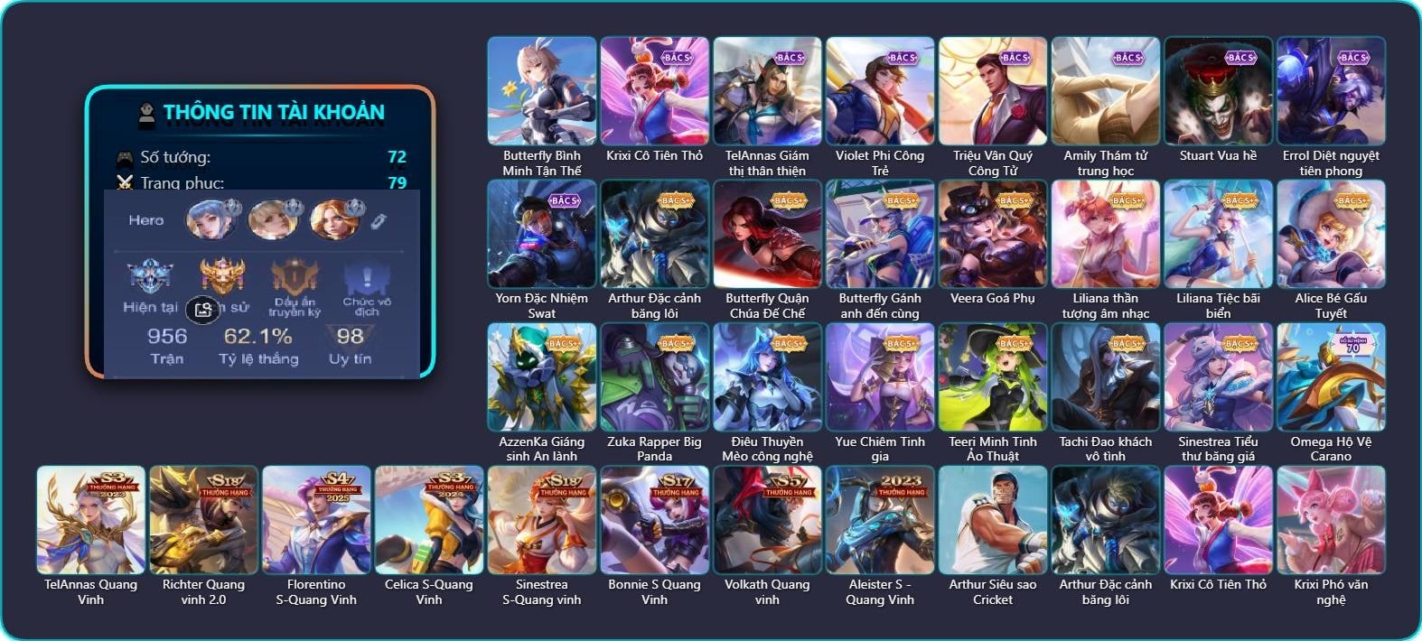 Arthur Siêu sao Cricket, Arthur Đặc cảnh băng lôi, Krixi Cô Tiên Thỏ, Krixi Phó văn nghệ, TelAnnas Giám thị thân thiện, TelAnnas Chung Tình Tiễn, Telannas Thánh nữ mật hội, Telannas Dạ hội, TelAnnas Quang Vinh, Valhein Hoàng tử Quạ, Butterfly Quận Chúa Đế Chế, Butterfly Gánh anh đến cùng, Butterfly Bình Minh Tận Thế, Violet Nữ đặc cảnh, Violet Phi Công Trẻ, Violet Phó học tập, Violet Huy Chương Vàng, Triệu Vân Quý Công Tử, Allain Lân sư Vũ thần, Amily Nữ đội trưởng, Amily Thám tử trung học, Maloch Đại ca Mukbang, Veera Goá Phụ, Veera Phù thủy Hội họa, Stuart Vua hề, Liliana Hồ Quý Phi, Liliana thần tượng âm nhạc, Liliana Tiệc bãi biển, Liliana Thuỷ thủ hồ ly, Alice Bé Gấu Tuyết, Alice Xứ sở thần tiên, Errol Diệt nguyệt tiên phong, Ilumia Nữ Chúa Tuyết, Ilumia Diva nổi loạn, Zephys Tư lệnh viễn chinh, Yorn Đặc Nhiệm Swat, Lauriel Đọa Lạc Thiên Sứ, Lauriel Đôi cánh Nguyệt thực, AzzenKa Giáng sinh An lành, Azzenka U Hồn Sa Mạc, Zuka Rapper Big Panda, Bright Kỳ Lân Soái, Mganga Doombot Hủy Diệt, Yena Hoa tiêu Mộng giới, Arduin Nhà vô địch, Annette Xứ sở thần tiên, Richter Quang vinh 2.0, Richter Cứu hộ, Florentino S-Quang Vinh, Celica Nữ cao bồi, Celica S-Quang Vinh, Celica Tâm hồn trà sữa, Điêu Thuyền Mèo công nghệ, Ryoma Thợ Săn Tiền Thưởng, Ryoma Ailing Samurai, Capheny Hầu gái, Yue Tiểu công Chúa, Yue Chiêm Tinh gia, Teeri Minh Tinh Ảo Thuật, Tachi Đao khách vô tình, Ishar Giấc Mơ Ngọt Ngào, Slimz Siêu Cấp Tối Thượng, Sephera Quý tiểu thư, Sinestrea Tiểu thư băng giá, Sinestrea S-Quang vinh, Lindis Thám Tử Tư, Bijan Giai Điệu Giáng Sinh, Omega Hộ Vệ Carano, Bonnie S Quang Vinh, Xeniel Kim sí điểu, Volkath Quang vinh, Mina Tiệc Bánh Kẹo, TeeMee Xiếc Cung Đình, Airi Ninja Xanh Lá, Airi Quản lý tài năng, Hayate Bạch ảnh, Kaine Thợ Săn Chính Nghĩa, Elsu Xạ Thần Mộng Giới, Aleister S - Quang Vinh