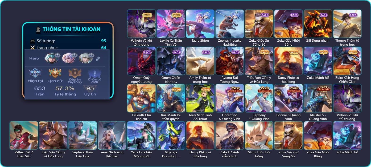 Valhein Vũ khí tối thượng, Valhein Số 7 Thần Sầu, Triệu Vân Cẩm y vệ Hỏa Long, Sephera Thủy Liên Hoa, Yena Nữ hoàng thể thao, Yena Hoa tiêu Mộng giới, Mganga Doombot Hủy Diệt, Darcy Pháp sư hỏa long, Zata Tư lệnh viễn chinh, Slimz Thỏ nhồi bông, Zuka Giáo Sư Sừng Sỏ, Zuka Gấu Nhồi Bông, Zuka Mãnh hổ, Zuka Xích Hùng Chiến Giáp, Max Trà Chanh, Hayate Bạch ảnh, Kaine Thợ Săn Chính Nghĩa, Enzo Phẩm chất quý tộc, Krixi Thần Thoại Hy Lạp, Florentino S-Quang Vinh, Errol Đêm Ác Mộng, Zill Dung nham, Zill Thần mộng mị, Kriknak Bọ Cánh Bạc, Airi Quản lý tài năng, Capheny S-Quang Vinh, Taara Shion, Grakk Thần ẩm thực, Ignis Vì sao con khóc, Thorne Thám tử trung học, Zephys Inosuke Hashibira, Telannas Thánh nữ mật hội, Telannas Dạ hội, Tel Annas Jujutsu Sorcerer, Arthur Lãnh chúa xương, Arthur Siêu sao Cricket, Annette Xứ sở thần tiên, Ngộ Không Cổ thần Ai Cập, Keera Hồ điệp, Xeniel Shipper bánh mỳ, Omen Sĩ Quan Viễn Chinh, Omen Quỷ nguyệt tướng, Omen Chiến binh trăng khuyết, Laville Tay đua đường phố, Laville Xạ Thần Tinh Vệ, KilGroth Cảnh Vệ Biển, KilGroth Chú lính chì, Raz Đại tù trưởng, Raz Mãnh lôi thần quyền, Thane Khoảnh khắc vinh quang, Bonnie S Quang Vinh, Tachi S-Vinh Quang, Elsu Xạ Thần Mộng Giới, Maloch Đại ca Mukbang, Bijan Giai Điệu Giáng Sinh, Teeri Minh Tinh Ảo Thuật, Ybneth Hạt trưởng kiểm lâm, Ybneth Candy Bear, Amily Thám tử trung học, Yan Nghệ nhân trung thu, Azzenka Ghẹo hay kẹo, Azzenka U Hồn Sa Mạc, Aleister S - Quang Vinh, Ryoma Đại Tướng Nguyệt Tộ