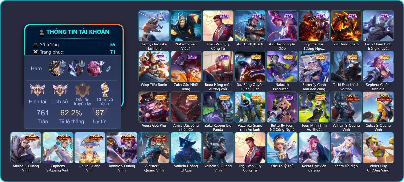 Valhein Hoàng tử Quạ, Valhein Đại Công Tước, Valhein Cá mập Nghiêm Túc, Valhein Thần tài, Valhein S-Quang Vinh, Triệu Vân Quý Công Tử, Triệu Vân Thần Tài, Krixi Công chúa Bướm, Krixi Phó văn nghệ, Veera Thiên nga đen, Veera My Melodys Love, Mganga Quái tặc không gian, Mganga Doombot Hủy Diệt, Yorn Cung thủ bóng đêm, Yorn Thần Thoại Hy Lạp, Gildur phượt thủ, Gildur Đại gia học viện, Azzenka Quang Vinh 2.0, AzzenKa Giáng sinh An lành, Azzenka U Hồn Sa Mạc, Lindis Thám Tử Tư, Lindis Quang Vinh, Lindis Đồng phục Shihakusho, Taara Hỏa Ngọc Nữ Đế, Taara Shion, Natalya Quý Cô Thủy Tề, Violet Nữ đặc cảnh, Violet Phó học tập, Violet Đặc Dị, Xeniel Kim sí điểu, Wisp Hải Tặc Nhí, Wisp Ếch nhồi bông, Wisp Máy phát quà, Điêu Thuyền Nữ y tá, Nakroth Chiến Binh Hỏa Ngục, Fennik Nhà thám hiểm, Zephys Phi thương, Zill Lốc Địa Ngục, Zill Dung nham, Zill Thần mộng mị, Elandorr Soái tặc, Murad Thợ Săn Tiền Thưởng, Murad Siêu việt, Murad S-Quang Vinh, Elsu Xạ Thần Mộng Giới, Arthur Hoàng kim cốt, Arthur Siêu sao Cricket, Arthur Đặc cảnh băng lôi, Hayate Bạch ảnh, Hayate Quỷ diện, Hayate Bạch vô thường, Hayate Bóng người dưới trăng, Volkath Quang vinh, Veres Đạo tặc, Qi Thiếu nữ pháo hoa, Richter Quang vinh 2.0, Errol Vượt ngục, Errol Đêm Ác Mộng, Florentino Vũ kiếm sư, Florentino Kiếm sĩ Olympic, Florentino Thần thoại Hy Lạp, Florentino S-Quang Vinh, Max Quang Vinh, Max Tiểu King Kong, Airi Ninja Xanh Lá, Airi Đặc công tử điệp, Airi Lễ hội mùa xuân, Airi Quản lý tài năng, KilGroth Cảnh Vệ Biển, Enzo Thần thoại Hy Lạp, Ryoma Thợ Săn Tiền Thưởng, Ryoma Đại Tướng Nguyệt Tộc, Ryoma Dạ hội, TelAnnas Cảnh Vệ Rừng, TelAnnas Giám thị thân thiện, TelAnnas Chung Tình Tiễn, Telannas Thánh nữ mật hội, Telannas Dạ hội, TelAnnas Quang Vinh, Tel Annas Jujutsu Sorcerer, Arduin Quang Vinh, Zuka Đại Phú Ông, Zuka Phát Tài, Zuka Gấu Nhồi Bông, Zuka Đầu bếp hoàng cung, Zuka Rapper Big Panda, Quillen Trưởng ngoại khoa, Ybneth Candy Bear, Zip Cá siêu quậy, Yena Hoa tiêu Mộng giới, Slimz Thỏ Thợ Mỏ, Slimz Thỏ nhồi bông, Dirak Cảnh Vệ Bầu Trời, Dirak Quý tộc, Keera Nghệ sĩ Graffiti, Butterfly Thủy thủ, Teemee Tay đua siêu tốc, Laville Tay đua đường phố, Laville Tay súng diệt thần, Laville Tay súng vô địch, Preyta Băng Hỏa Long Sư, Preyta Phi cơ F1, Ishar Capoo Boom, Sephera Phi vụ thế kỷ, Caesar Bão tố, Thorne Thám tử trung học, Amily Đặc công nhện đỏ, Amily Hội ám hoàng, Amily Thám tử trung học, Tulen Phù Thủy Kiến Tạo, Raz Đại tù trưởng, Aleister Quỷ soái nguyệt tộc, Aleister S - Quang Vinh, Arum Thú Vệ Cổ Mộ, Arum Nữ hoàng gấu xám, Bright Kỳ Lân Soái, Dextra Quý cô Tuổi Dần, Omen Sĩ Quan Viễn Chinh, Lauriel Đọa Lạc Thiên Sứ, Grakk Khô Lâu Đại Tướng, Capheny Hầu gái, Yan Nghệ nhân trung thu, Roxie Lễ hội hoa, Roxie Hỏa thuật sư, Maloch Ác Ma Địa Ngục, Maloch Samurai Tử Sĩ, Maloch Đại ca Mukbang, Aya Điệp viên ký ức, Teeri Minh Tinh Ảo Thuật, Annette Xứ sở thần tiên, Liliana Hồ Quý Phi, Liliana Thuỷ thủ hồ ly, Sinestrea S-Quang vinh, Marja Linh Xà Tư Tế, Bonnie S Quang Vinh, Bijan Giai Điệu Giáng Sinh, Ignis Vì sao con khóc