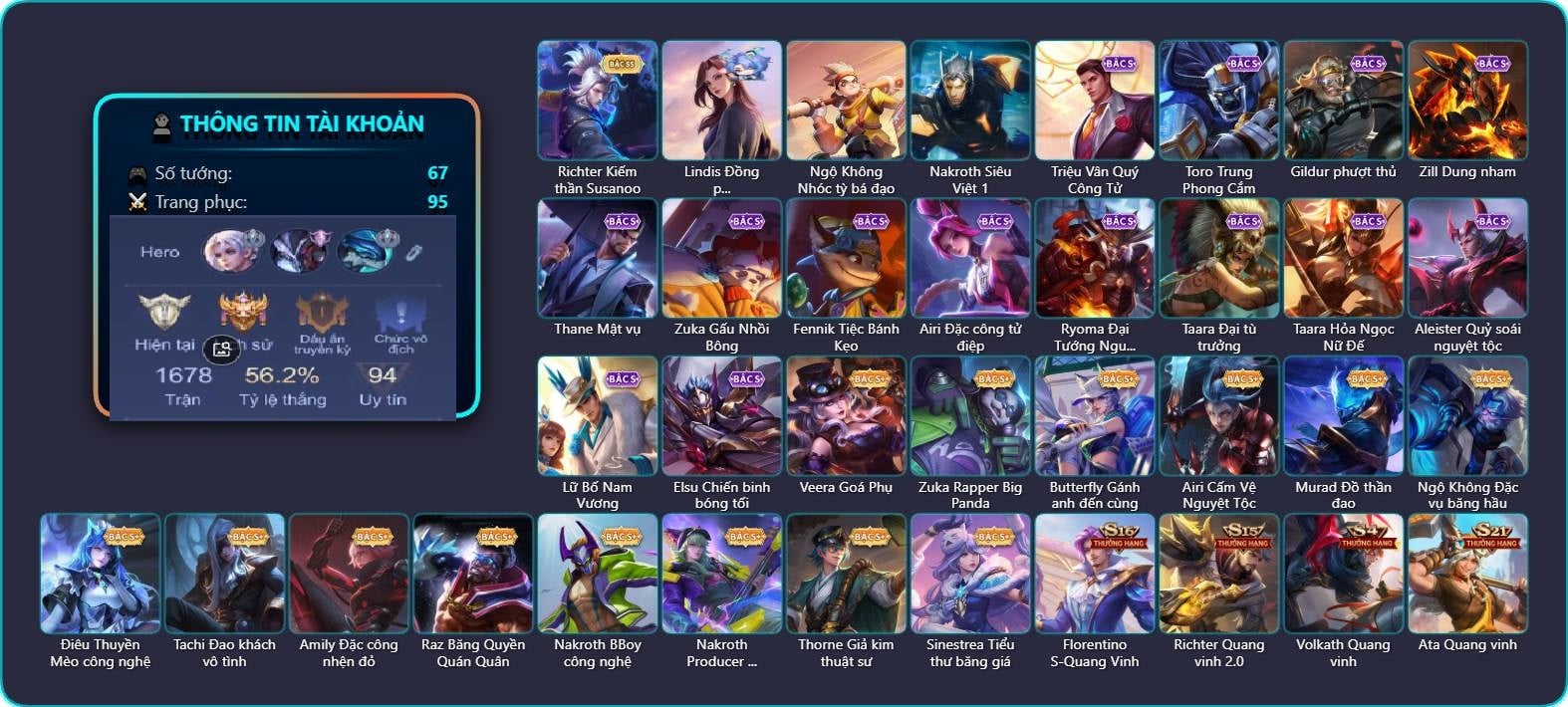 Valhein Hoàng tử Quạ, Triệu Vân Quý Công Tử, Veera Goá Phụ, Zephys Tư lệnh viễn chinh, Toro Trung Phong Cắm, Toro Bạch mao Ngưu, Gildur phượt thủ, Zill Dung nham, Zill Thần mộng mị, Thane Mật vụ, Arthur Hoàng kim cốt, Slimz Siêu Cấp Tối Thượng, Teemee Tay đua siêu tốc, Maloch Tiệc hóa trang, Maloch Đại ca Mukbang, Zuka Gấu Nhồi Bông, Zuka Đầu bếp hoàng cung, Zuka Rapper Big Panda, Hayate Bạch ảnh, Hayate Bạch lang, Lindis Đồng phục Shihakusho, Florentino Vũ kiếm sư, Florentino Kiếm sĩ Olympic, Florentino S-Quang Vinh, Richter Kiếm thần Susanoo, Richter Quang vinh 2.0, Preyta Phi cơ F1, Dirak Quý tộc, Enzo Phẩm chất quý tộc, Enzo Nhà Leo núi, Butterfly Gánh anh đến cùng, Fennik Nhà thám hiểm, Fennik Tiệc Bánh Kẹo, Kriknak Bọ Cánh Bạc, Mina Chị đại lắm chiêu, Omega Người máy xanh, Omega Hộ vệ ba bích, Airi Quái xế công nghệ, Airi Cấm Vệ Nguyệt Tộc, Airi Đặc công tử điệp, Airi Lễ hội mùa xuân, Yena Nữ hoàng thể thao, Murad Thợ Săn Tiền Thưởng, Murad Đồ thần đao, Murad Điệp viên Anubis, Ngộ Không Đặc vụ băng hầu, Ngộ Không Nhóc tỳ bá đạo, Ngộ Không Cổ thần Ai Cập, Volkath Tư lệnh viễn chinh, Volkath Quang vinh, Kahlii Rối Nước Thuỷ Đình, Allain Lân sư Vũ thần, Ryoma Thợ Săn Tiền Thưởng, Ryoma Đại Tướng Nguyệt Tộc, Mganga Doombot Hủy Diệt, Điêu Thuyền Mèo công nghệ, Ata Quang vinh, Ata Mèo đi mưa, Tachi Lãng khách, Tachi Đao khách vô tình, Taara Đại tù trưởng, Taara Hỏa Ngọc Nữ Đế, Aleister Quỷ soái nguyệt tộc, Aleister S - Quang Vinh, Amily Đặc công nhện đỏ, Raz Đại tù trưởng, Raz Băng Quyền Quán Quân, Nakroth BBoy công nghệ, Nakroth Producer Tia chớp, Nakroth Siêu Việt 1, Alice The Butterfly Mansion Girl, Roxie Lễ hội hoa, Lữ Bố Nam Vương, Lumburr Máy Đào Khoáng, Marja Linh Xà Tư Tế, Capheny Hầu gái, Liliana Hồ Quý Phi, Elsu Mafia, Elsu Chiến binh bóng tối, Celica S-Quang Vinh, Thorne Giả kim thuật sư, Sinestrea Tiểu thư băng giá, Sinestrea S-Quang vinh, Lauriel Đọa Lạc Thiên Sứ, Annette Xứ sở thần tiên, Arum Thần tượng nhạc Rock, Laville Thám tử học đường, Skud Sơn Tặc, KilGroth Cảnh Vệ Biển, KilGroth Càn Nguyên Thủ Vệ, Ignis Nguyệt lão, Astrid Nữ tổng tài, Bonnie S Quang Vinh, Xeniel Thiên Sứ Hủy Diệt, Ming thầy tướn